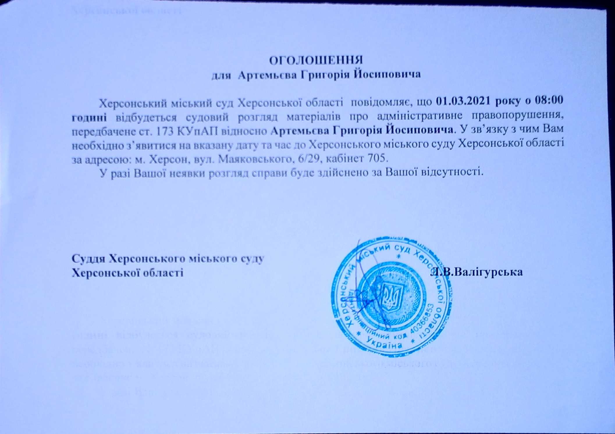 ОГОЛОШЕННЯ для Артемьєва Григорія Йосиповича