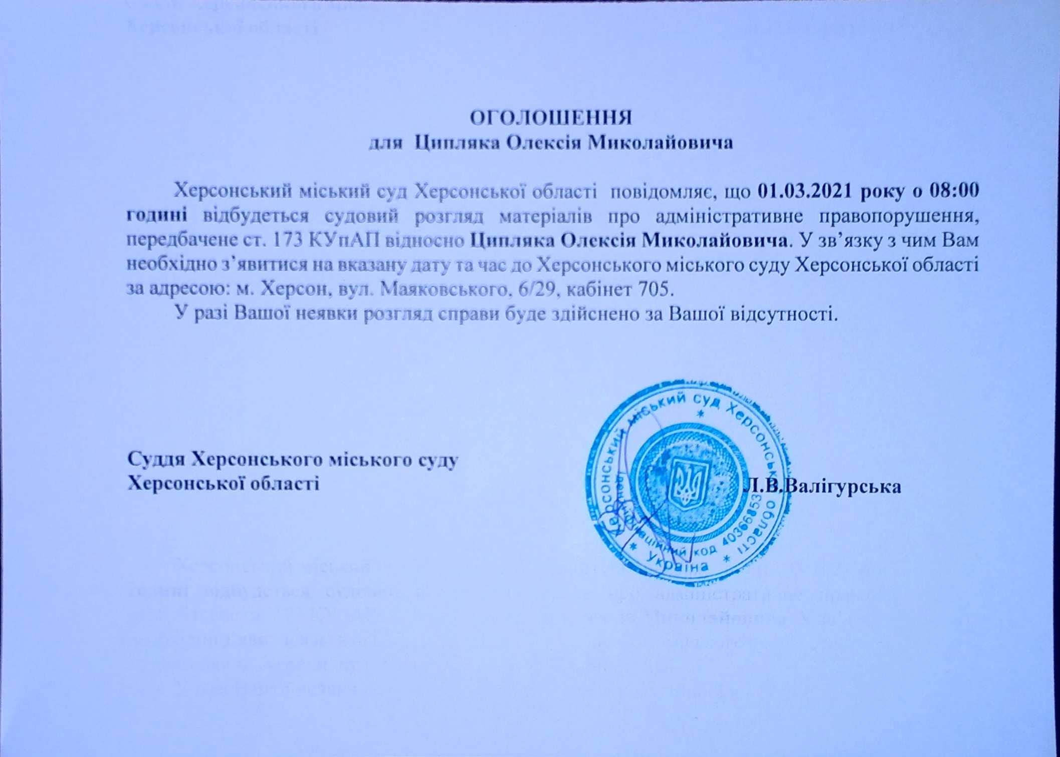 ОГОЛОШЕННЯ для Ципляка Олексія Миколайовича