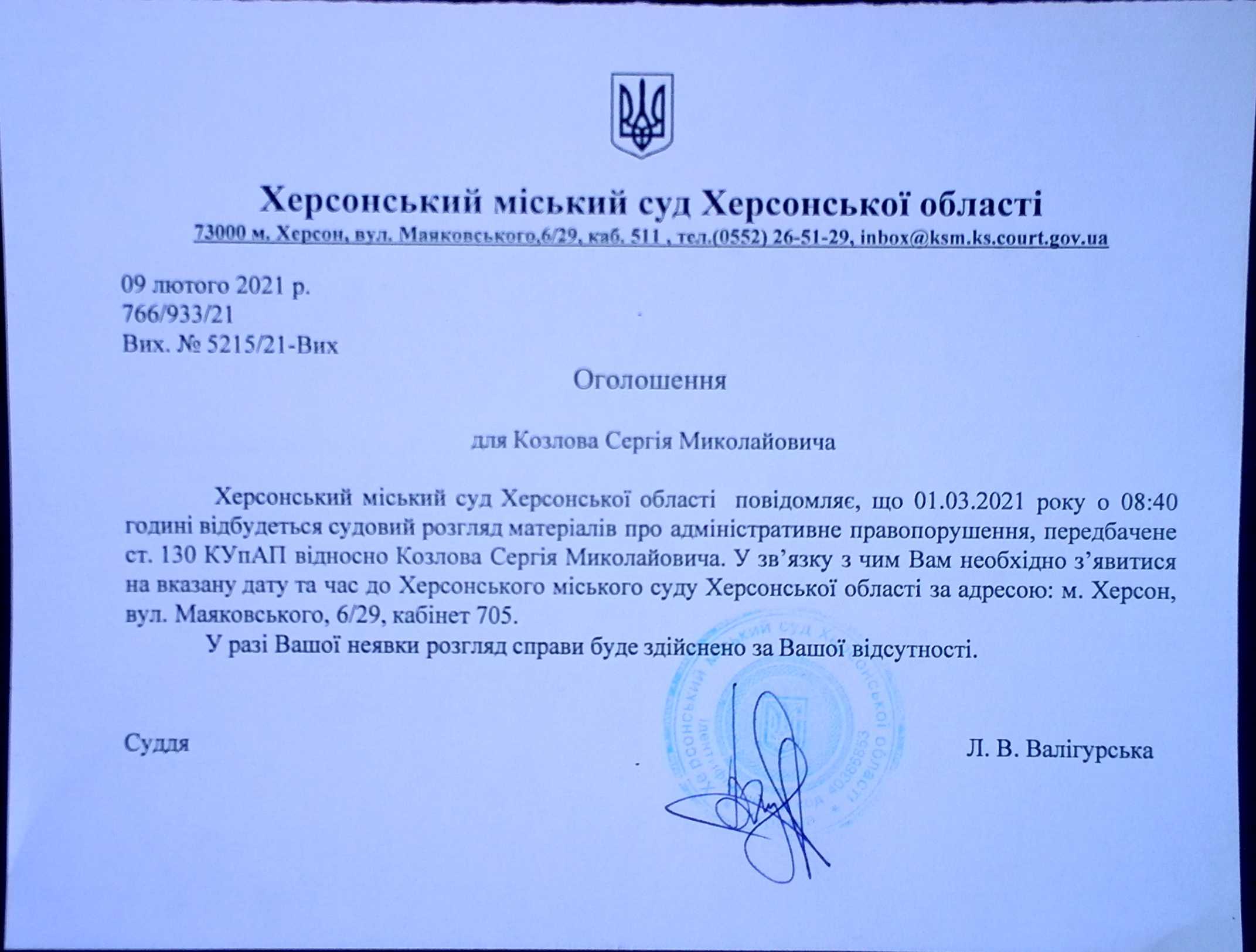 ОГОЛОШЕННЯ ПРО ВИКЛИК ДО СУДУ