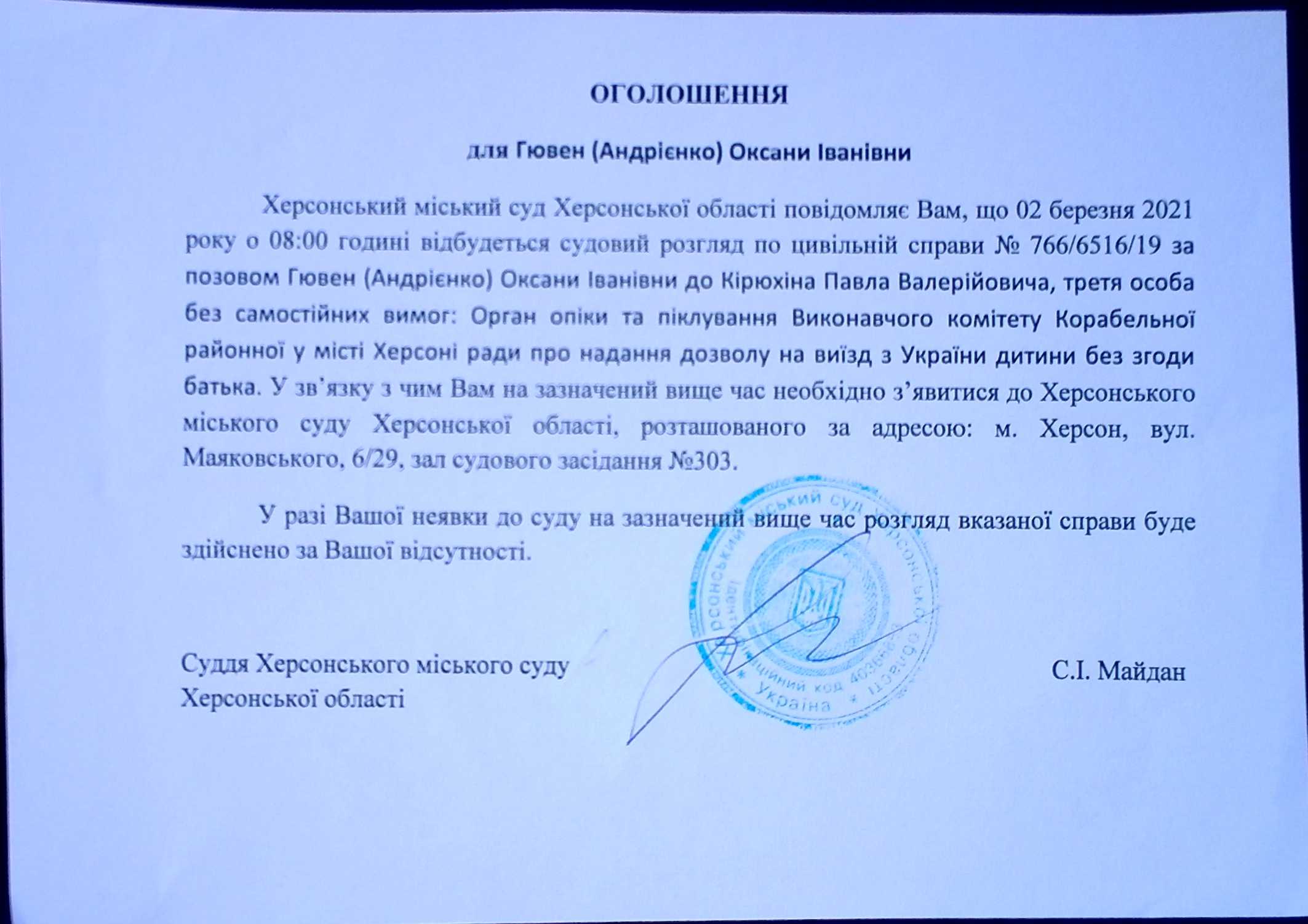 ОГОЛОШЕННЯ для Гювен (Андрієнко) Оксани Іванівни
