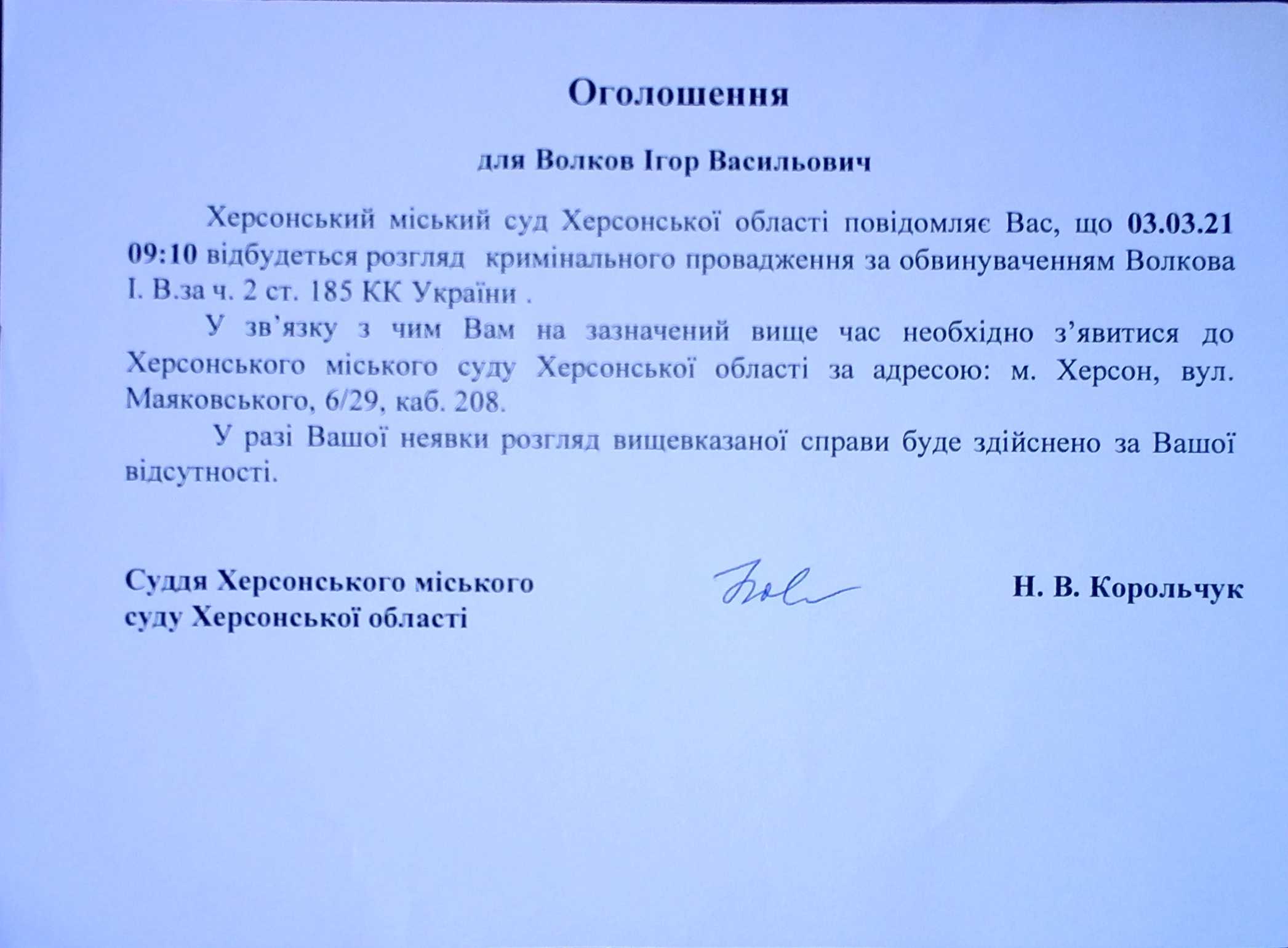 ОГОЛОШЕННЯ для Волкова Ігоря Васильовича