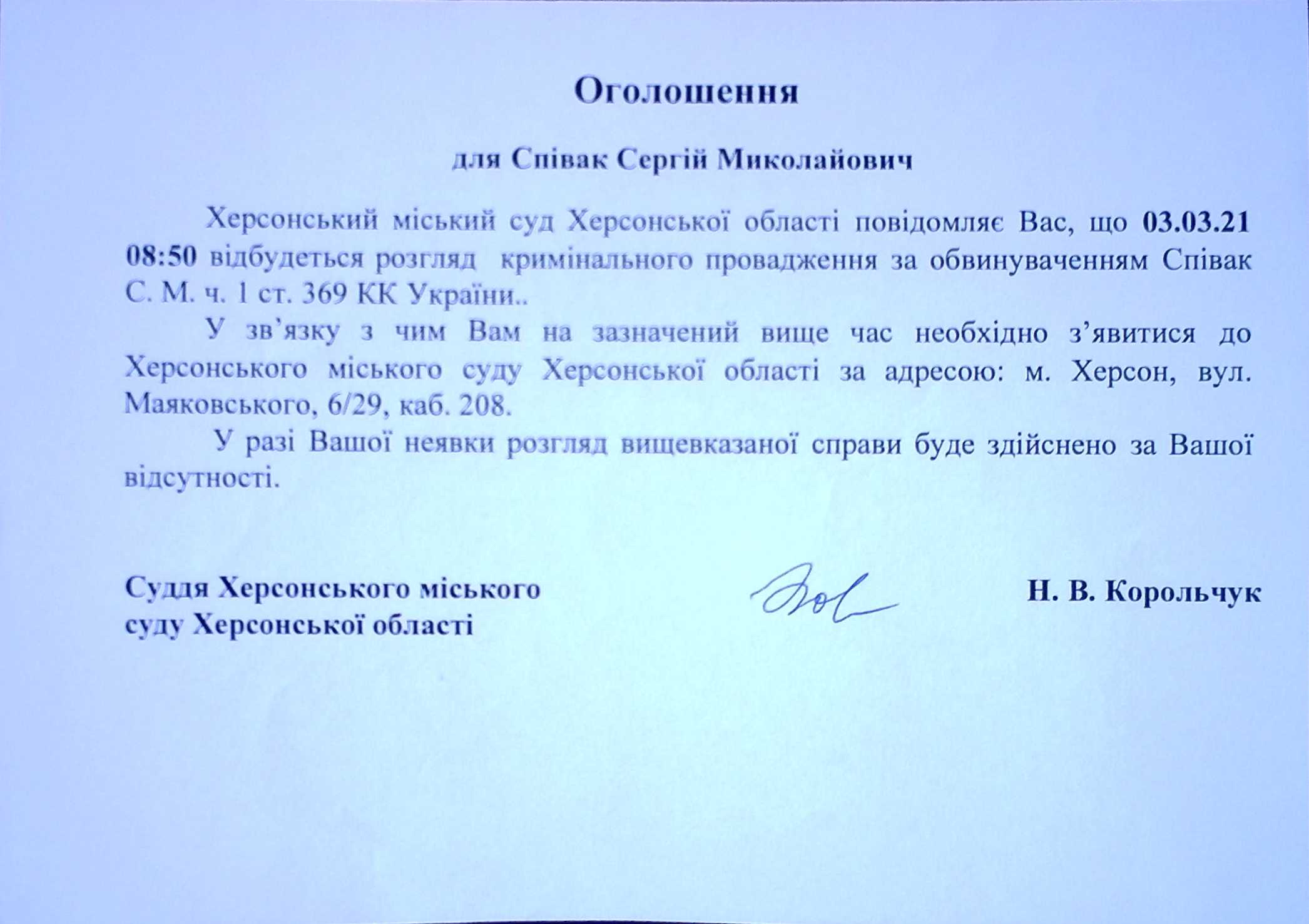ОГОЛОШЕННЯ ПРО ВИКЛИК ДО СУДУ