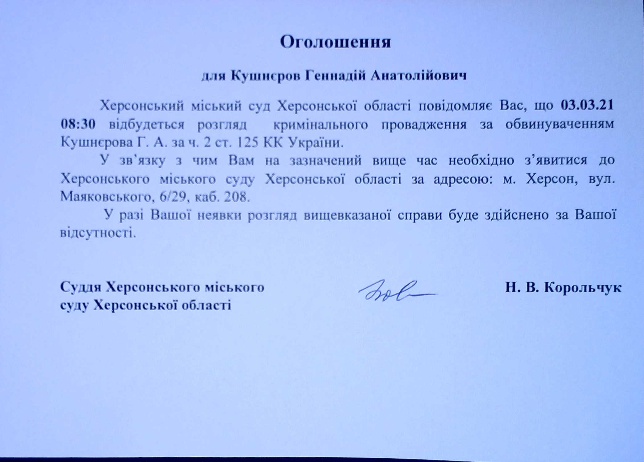 ОГОЛОШЕННЯ для Кушнєрова Геннадія Анатолійовича