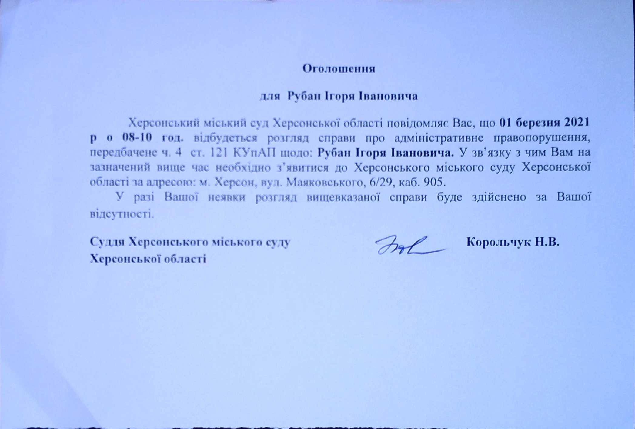 ОГОЛОШЕННЯ для Рубан Ігоря Івановича