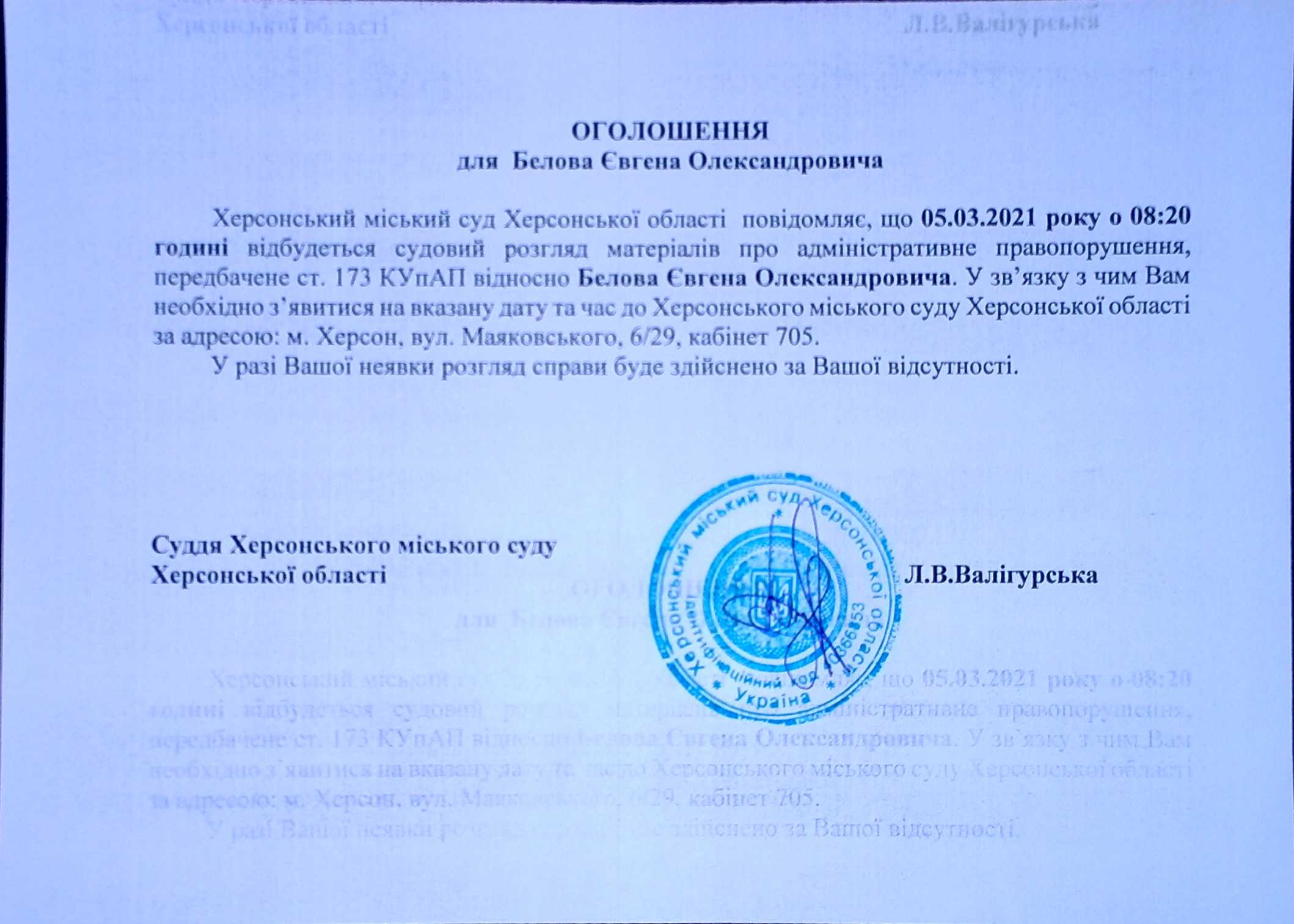 ОГОЛОШЕННЯ для Белова Євгена Олександровича