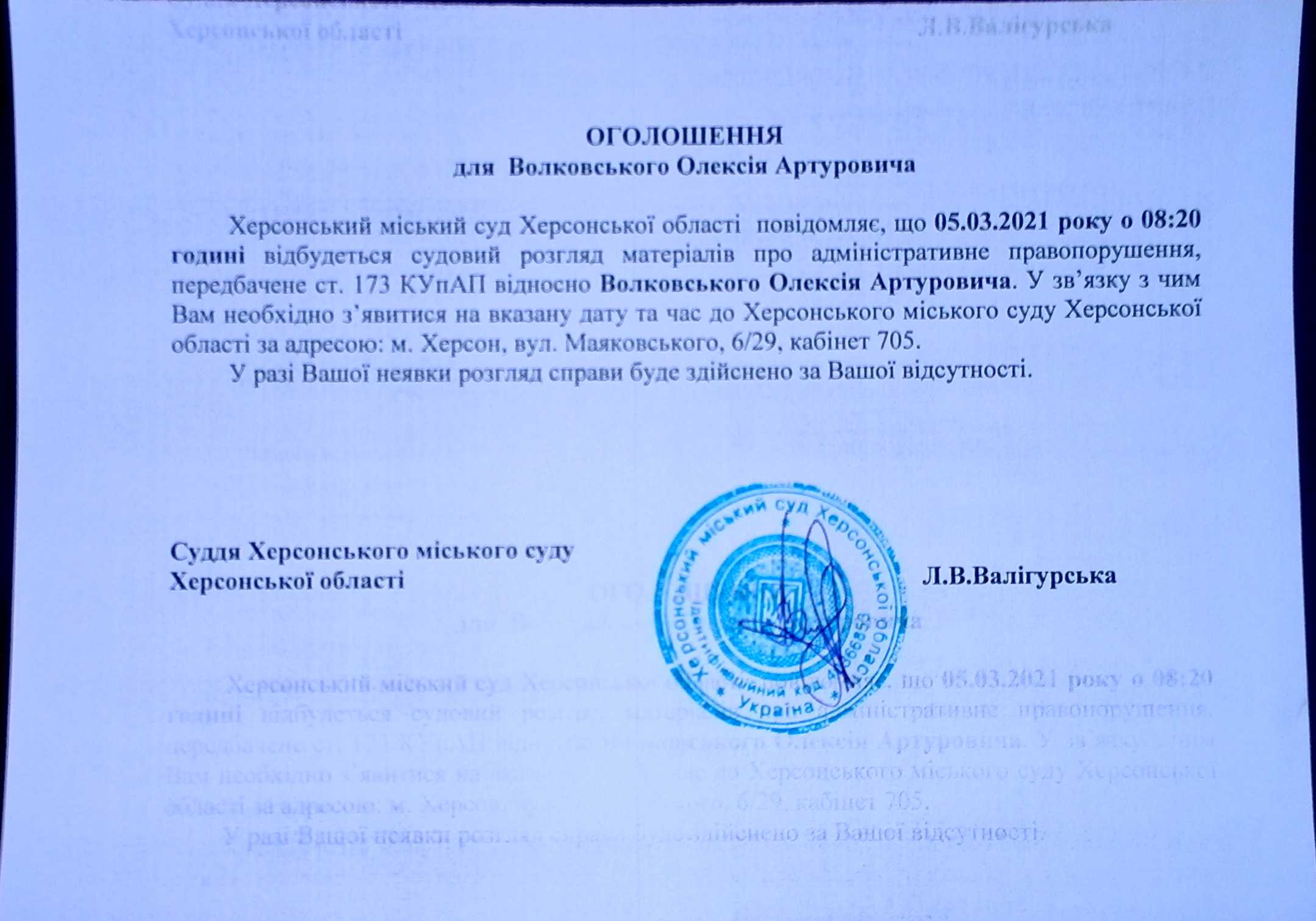 ОГОЛОШЕННЯ для Волковського Олексія Артуровича