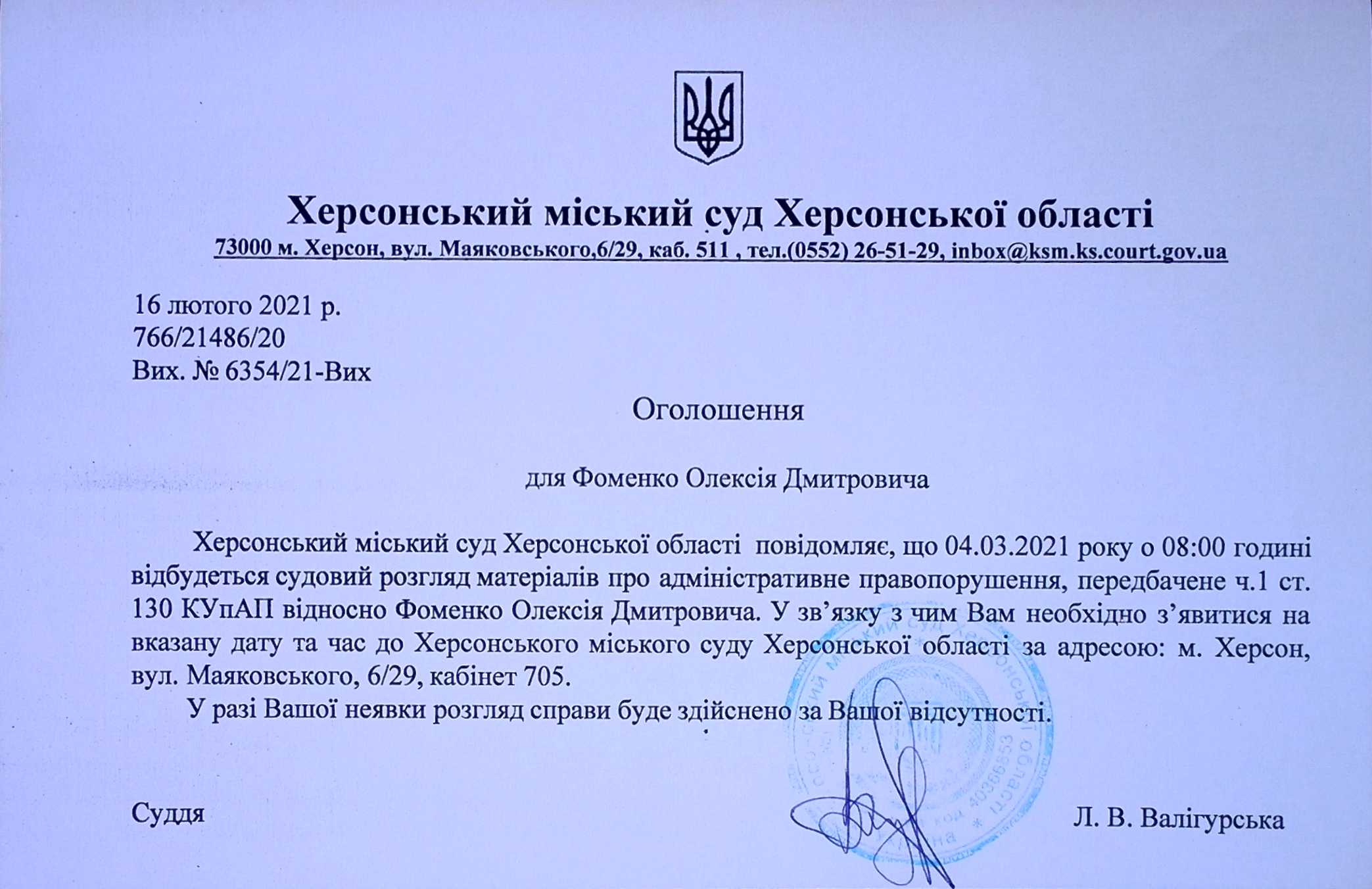 ОГОЛОШЕННЯ для Фоменко Олексія Дмитровича