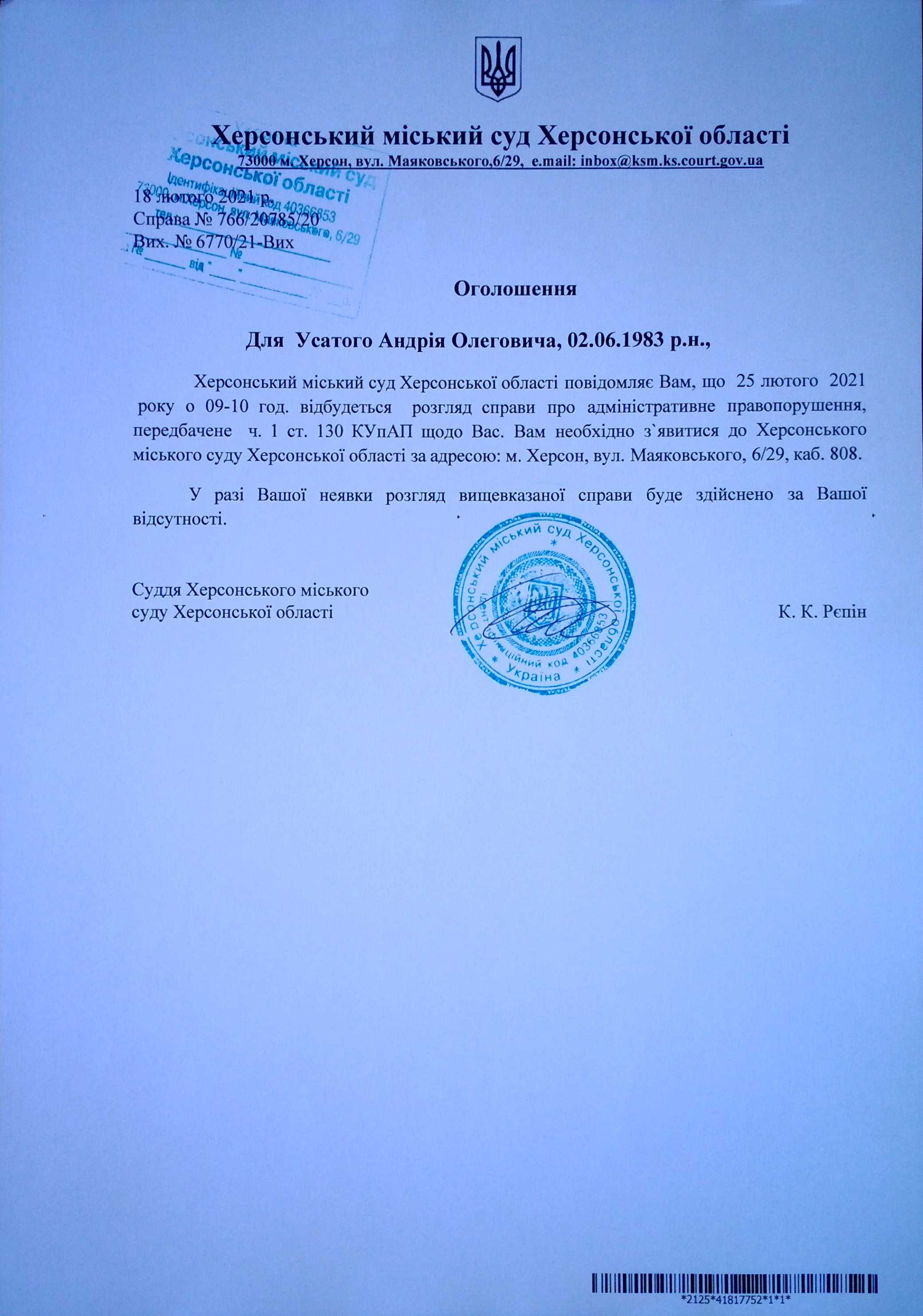 ОГОЛОШЕННЯ для Усатого Андрія Олеговича
