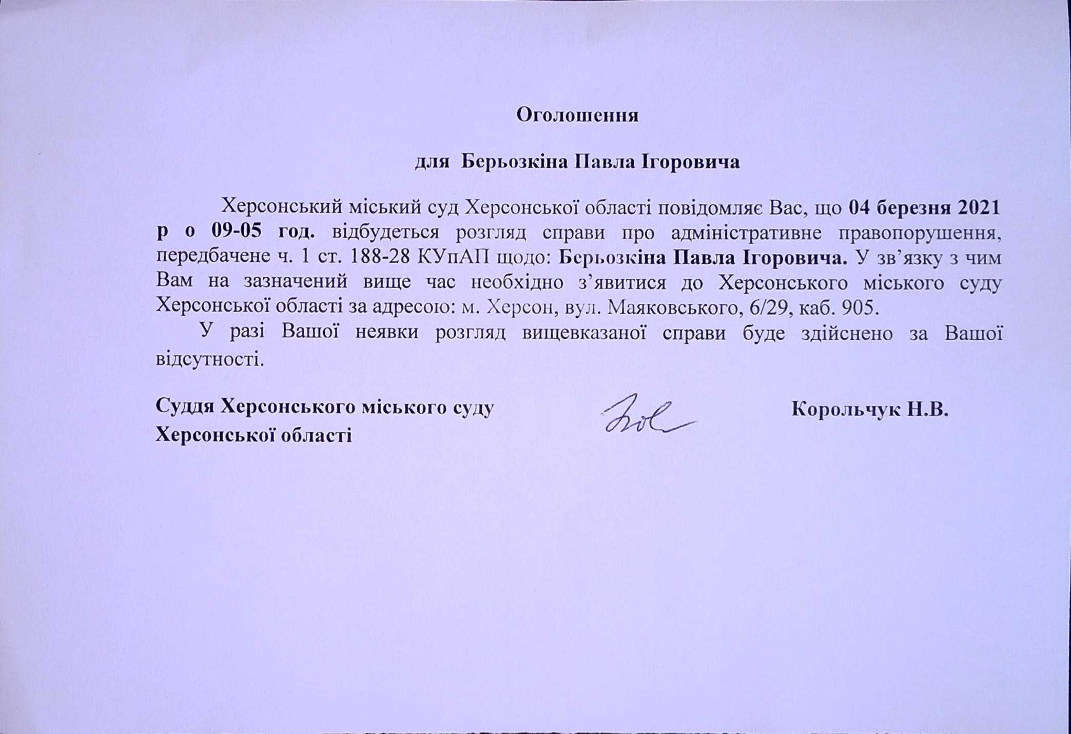 ОГОЛОШЕННЯ для Берьозкіна Павла Ігоровича