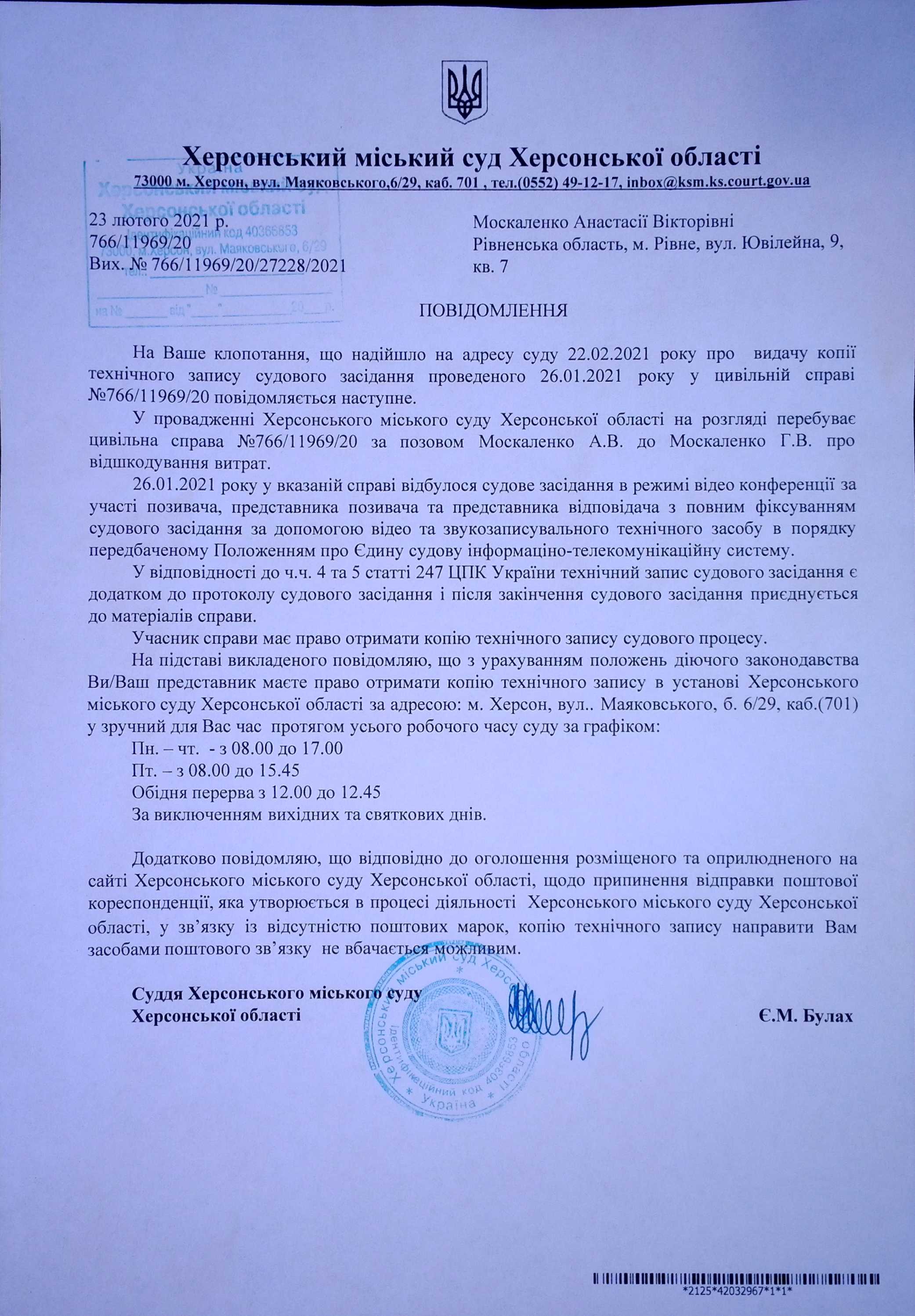 ОГОЛОШЕННЯ для Москаленко Анастасії Вікторівни про можливість отримання копії технічного запису с/з в приміщенні Херсонського міського суду
