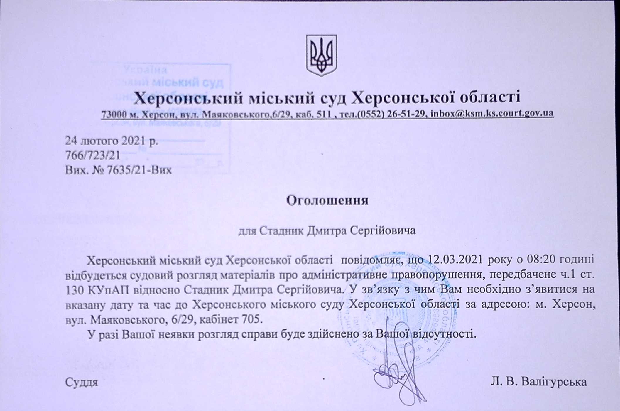 ОГОЛОШЕННЯ для Стадника Дмитра Сергійовича