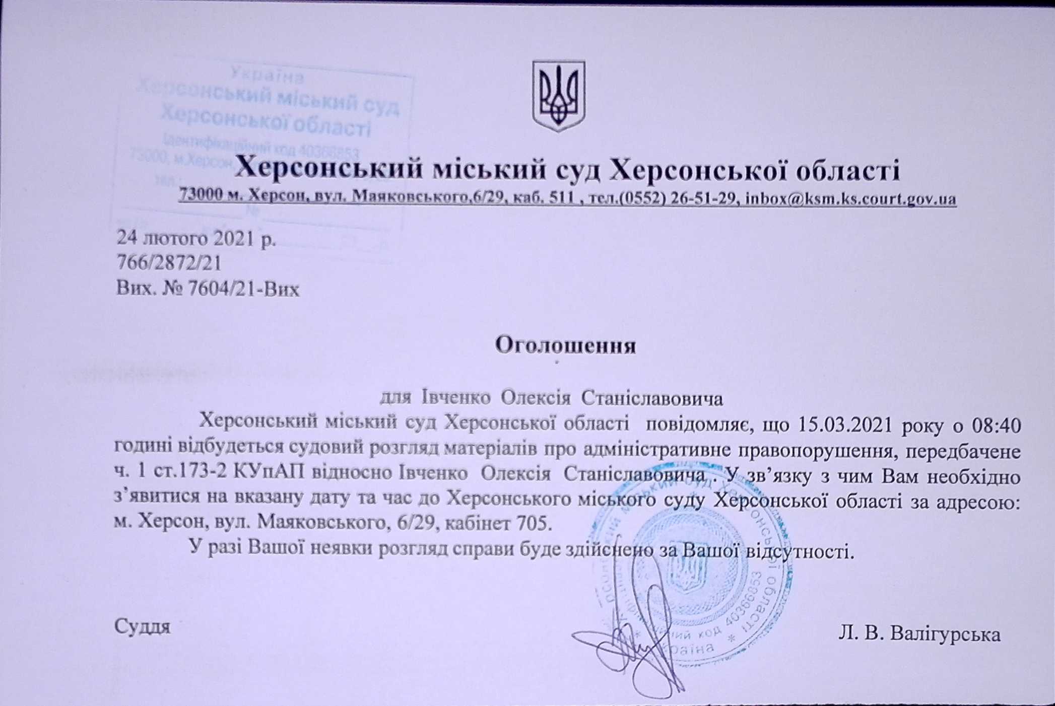 ОГОЛОШЕННЯ для Івченко Олексія Станіславовича