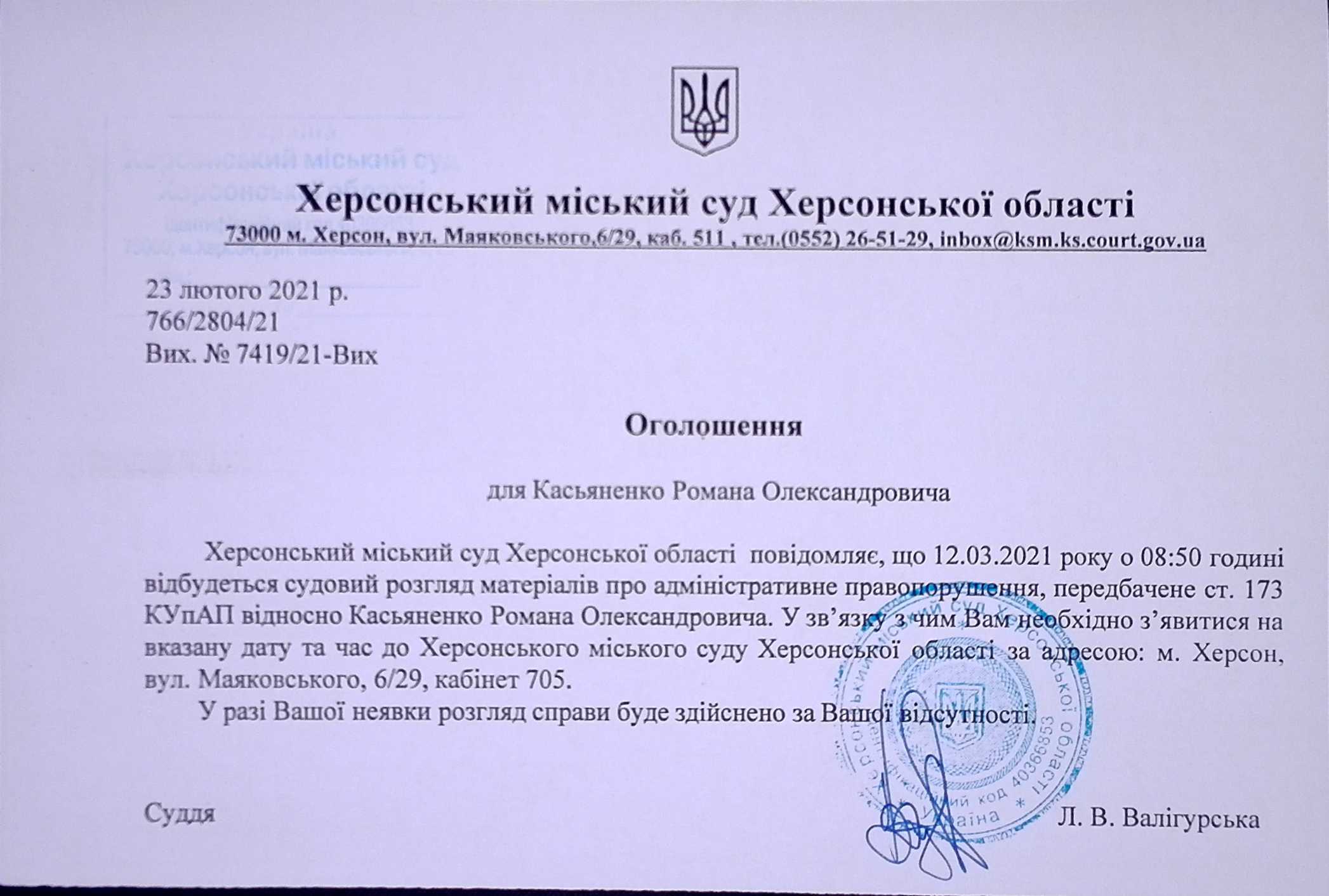 ОГОЛОШЕННЯ для Касьяненко Романа Олександровича