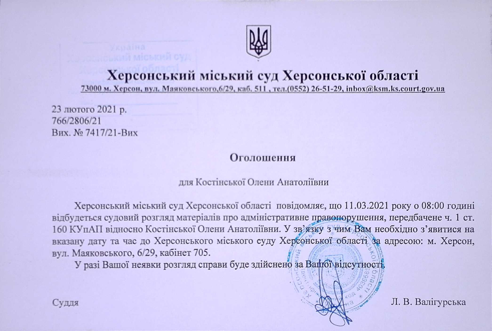 ОГОЛОШЕННЯ ПРО ВИКЛИК ДО СУДУ