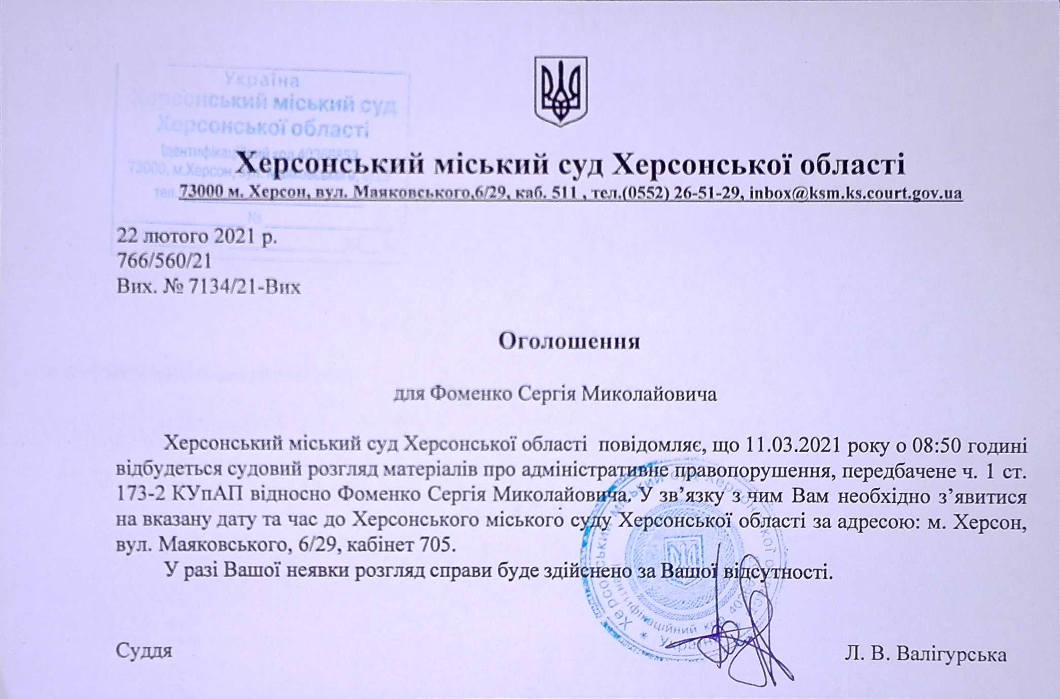ОГОЛОШЕННЯ для Фоменко Сергія Миколайовича