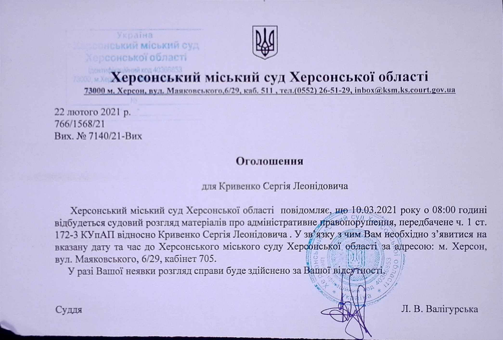 ОГОЛОШЕННЯ для Кривенко Сергія Леонідовича