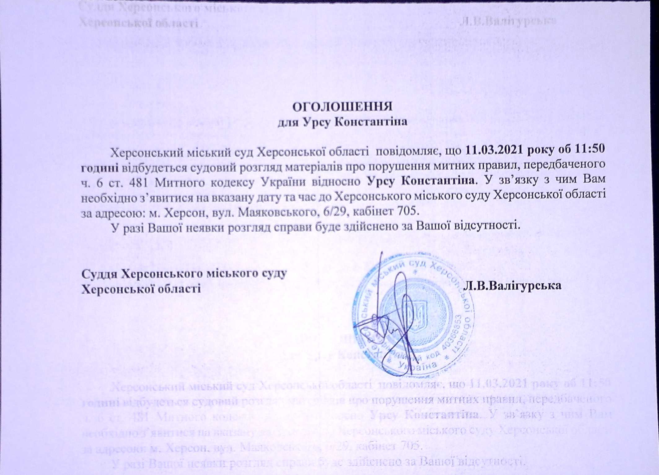 ОГОЛОШЕННЯ ПРО ВИКЛИК ДО СУДУ