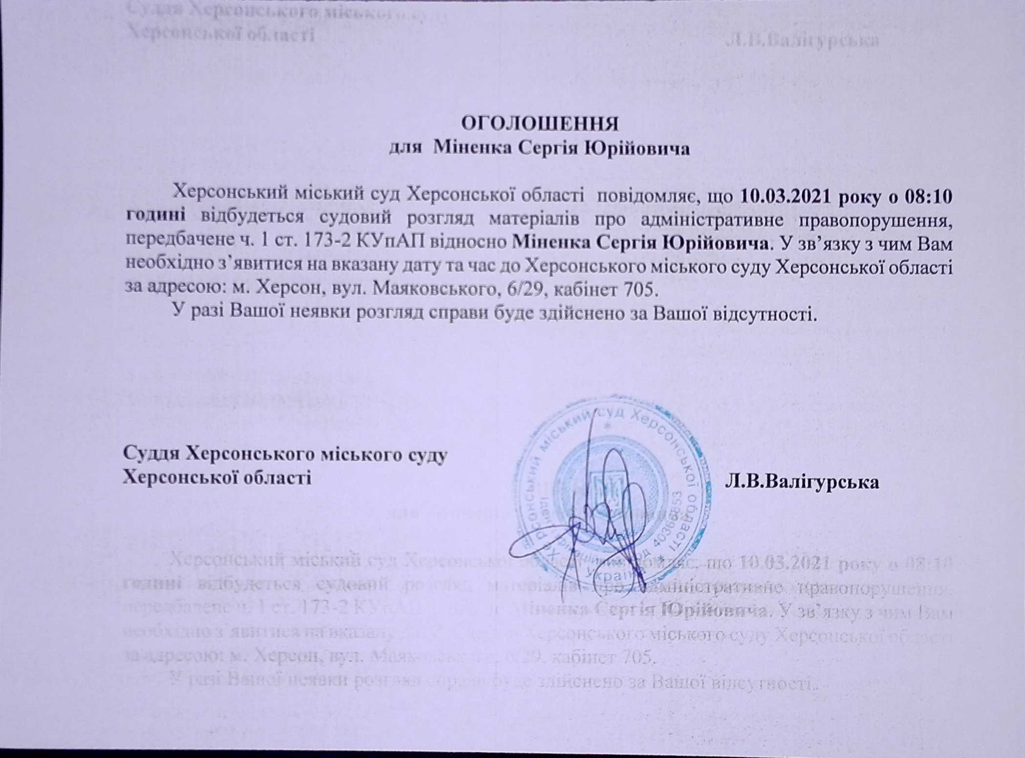 ОГОЛОШЕННЯ для Міненка Сергія Юрійовича