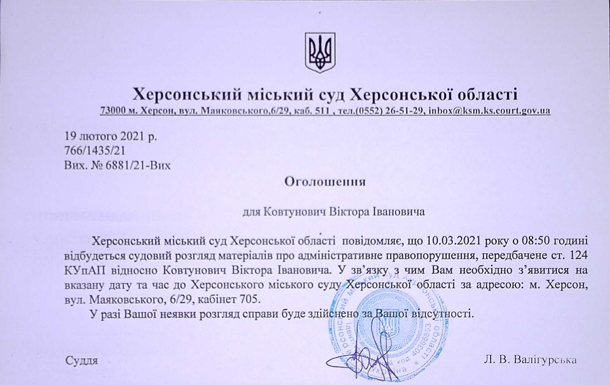ОГОЛОШЕННЯ ПРО ВИКЛИК ДО СУДУ