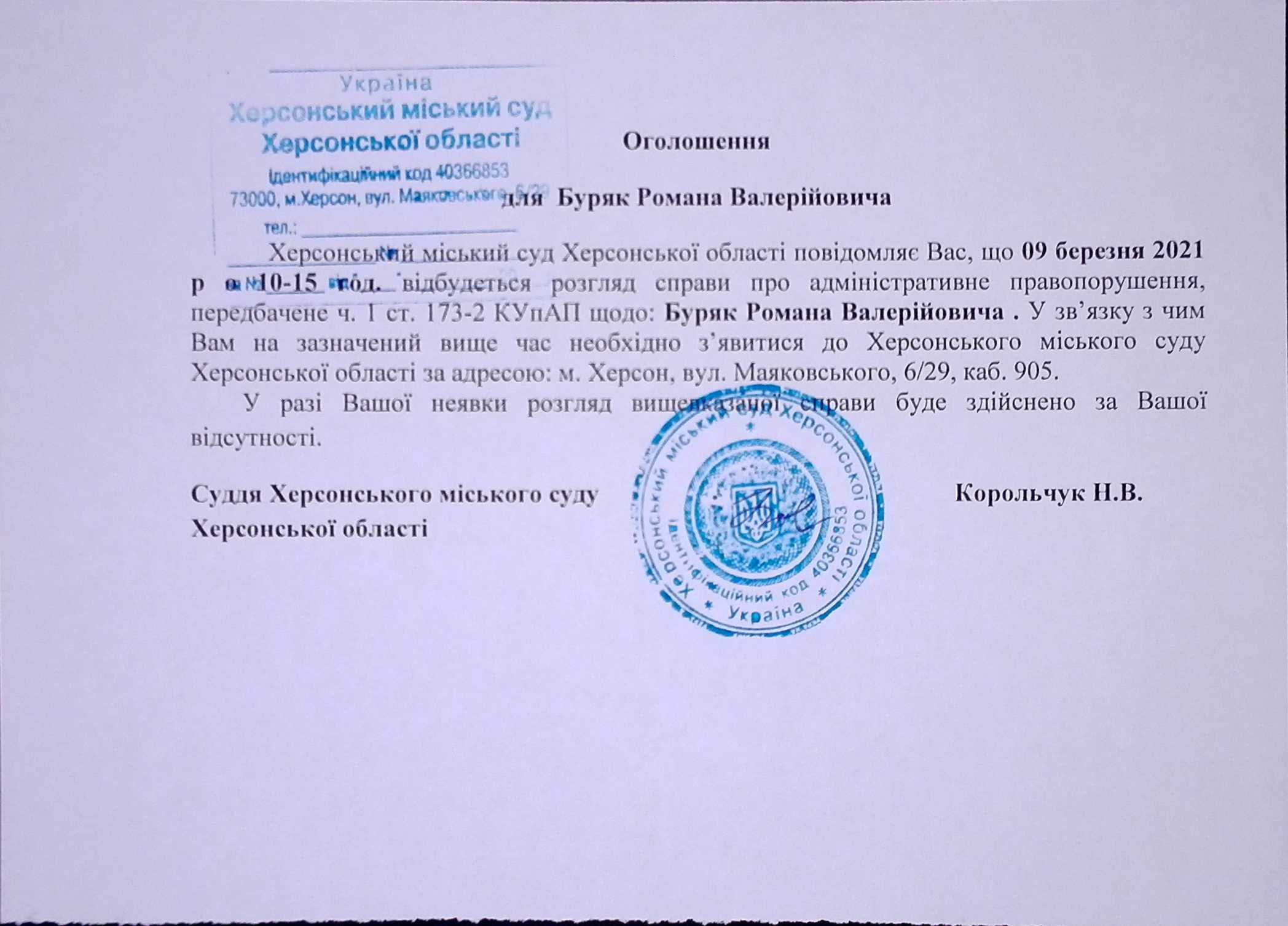 ОГОЛОШЕННЯ для Буряк Романа Валерійовича