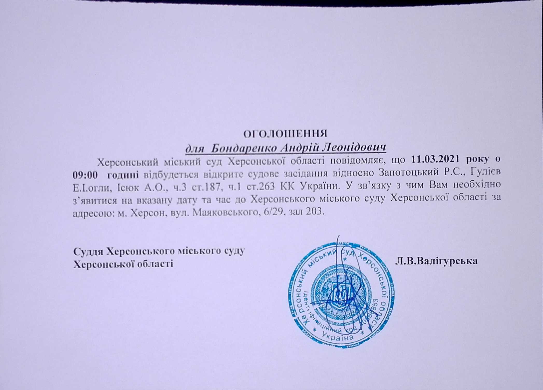 ОГОЛОШЕННЯ для Бондаренко Андрія Леонідовича