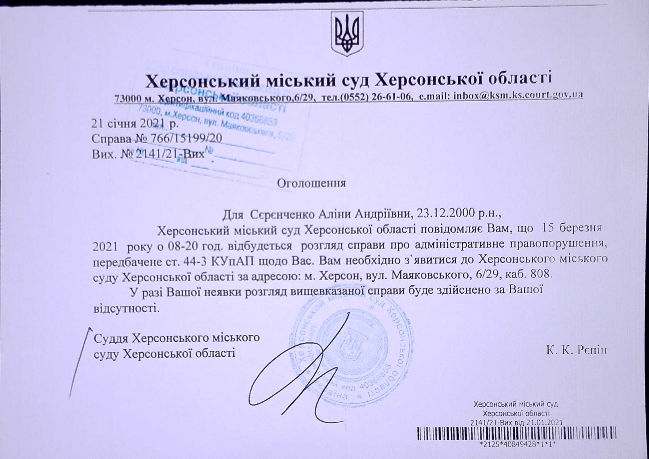 ОГОЛОШЕННЯ для Сєрєнченко Аліни Андріївни