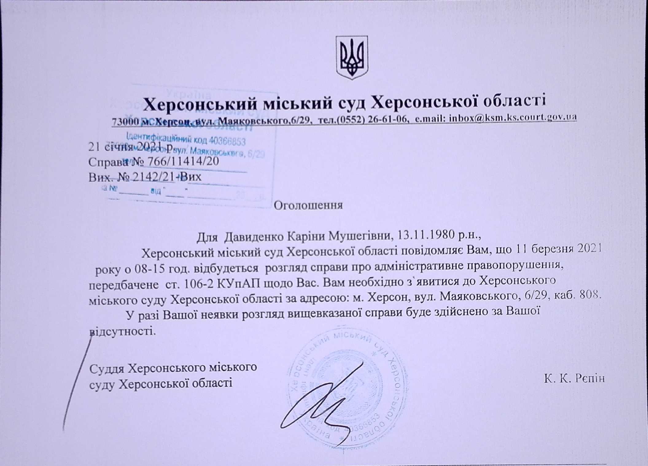 ОГОЛОШЕННЯ для Давиденко Каріни Мушегівни