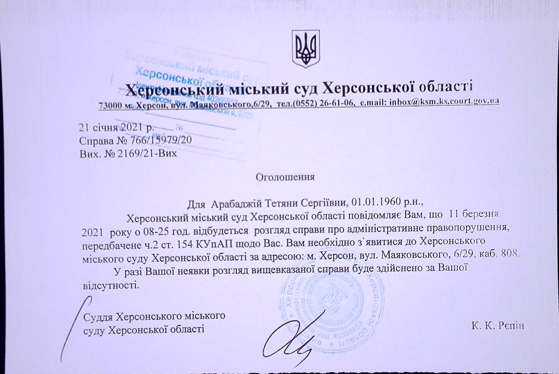 ОГОЛОШЕННЯ для Арабаджій Тетяни Сергіївни