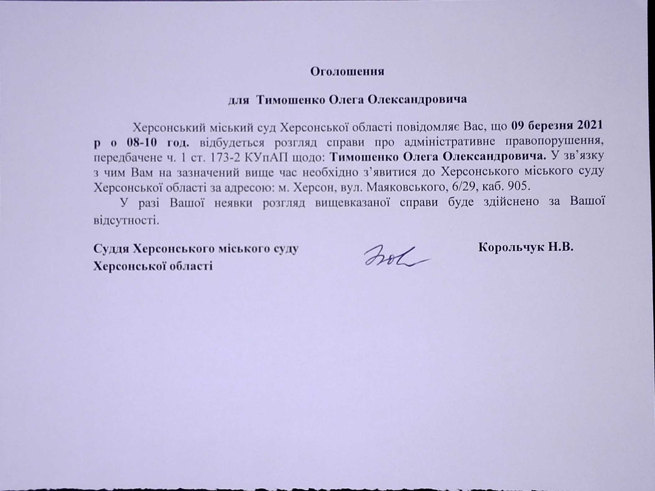 ОГОЛОШЕННЯ для Тимошенко Олега Олександровича