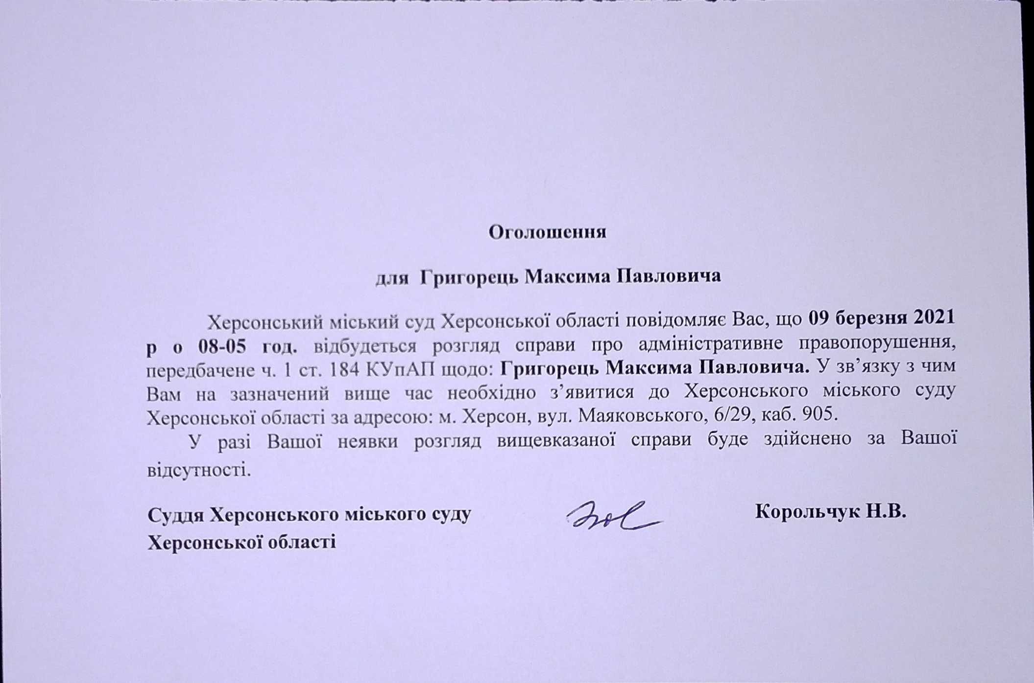 ОГОЛОШЕННЯ для Григорець Максима Павловича