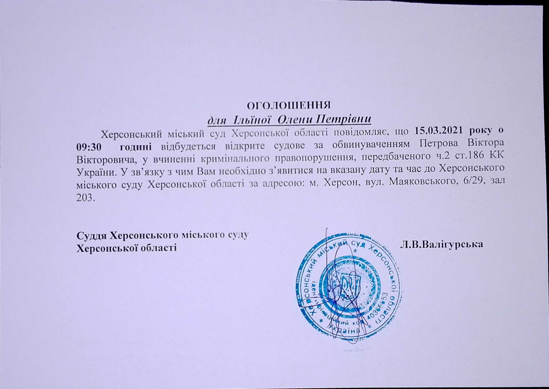 ОГОЛОШЕННЯ для Ільїної Олени Петрівни
