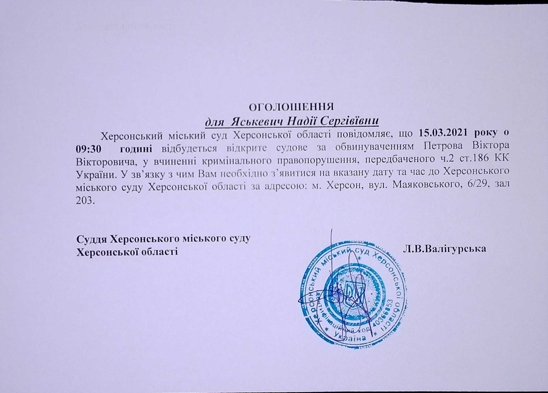 ОГОЛОШЕННЯ для Яськевич Надії Сергіївни