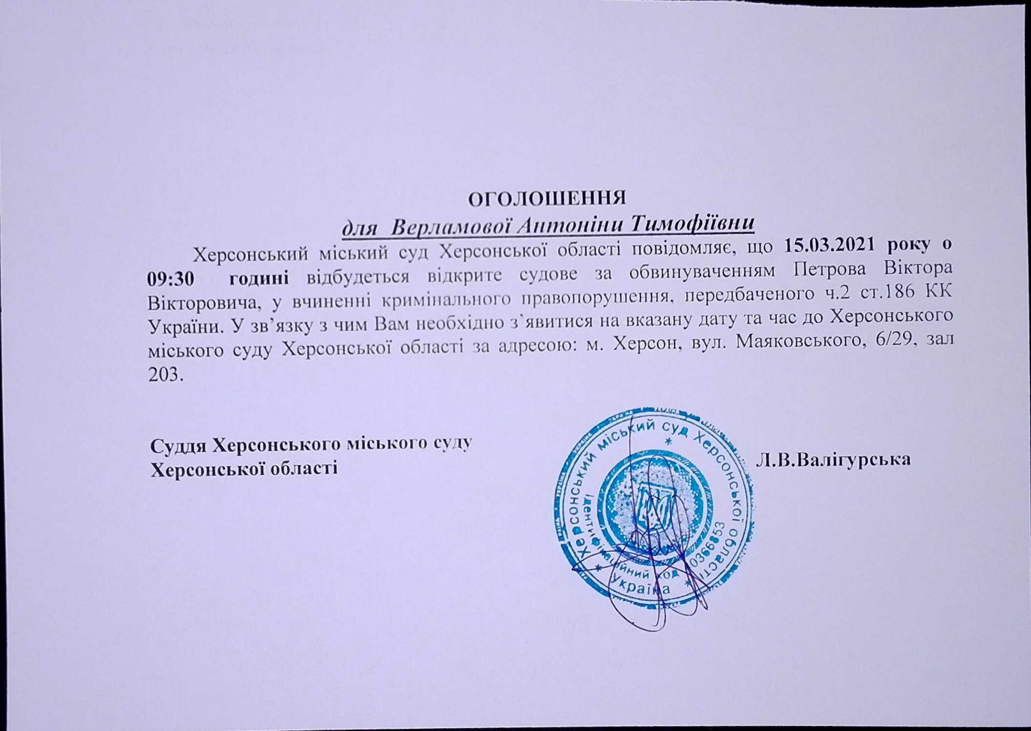 ОГОЛОШЕННЯ для Верламової Антоніни Тимофіївни