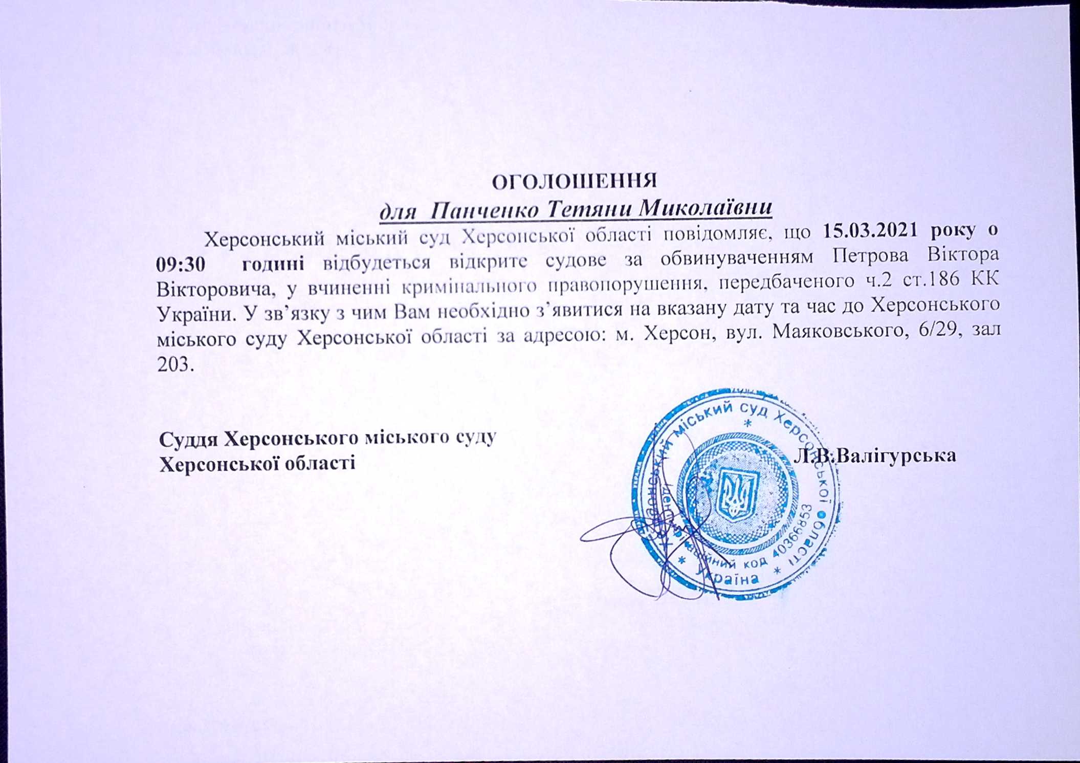 ОГОЛОШЕННЯ для Панченко Тетяни Миколаївни