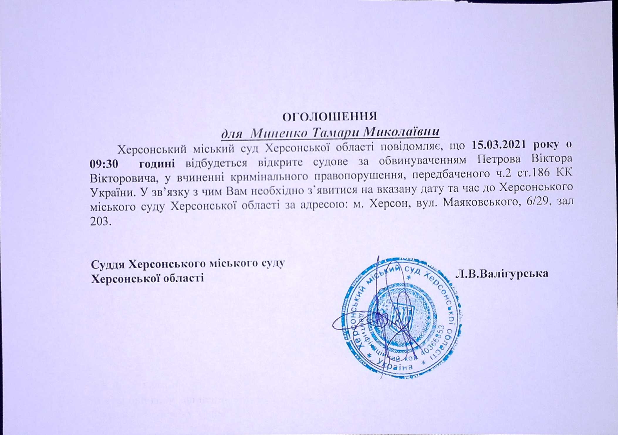 ОГОЛОШЕННЯ для Миненко Тамари Миколаївни