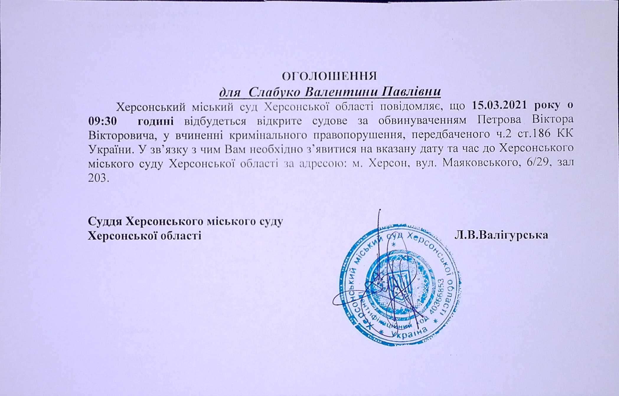 ОГОЛОШЕННЯ для Слабуко Валентини Павлівни