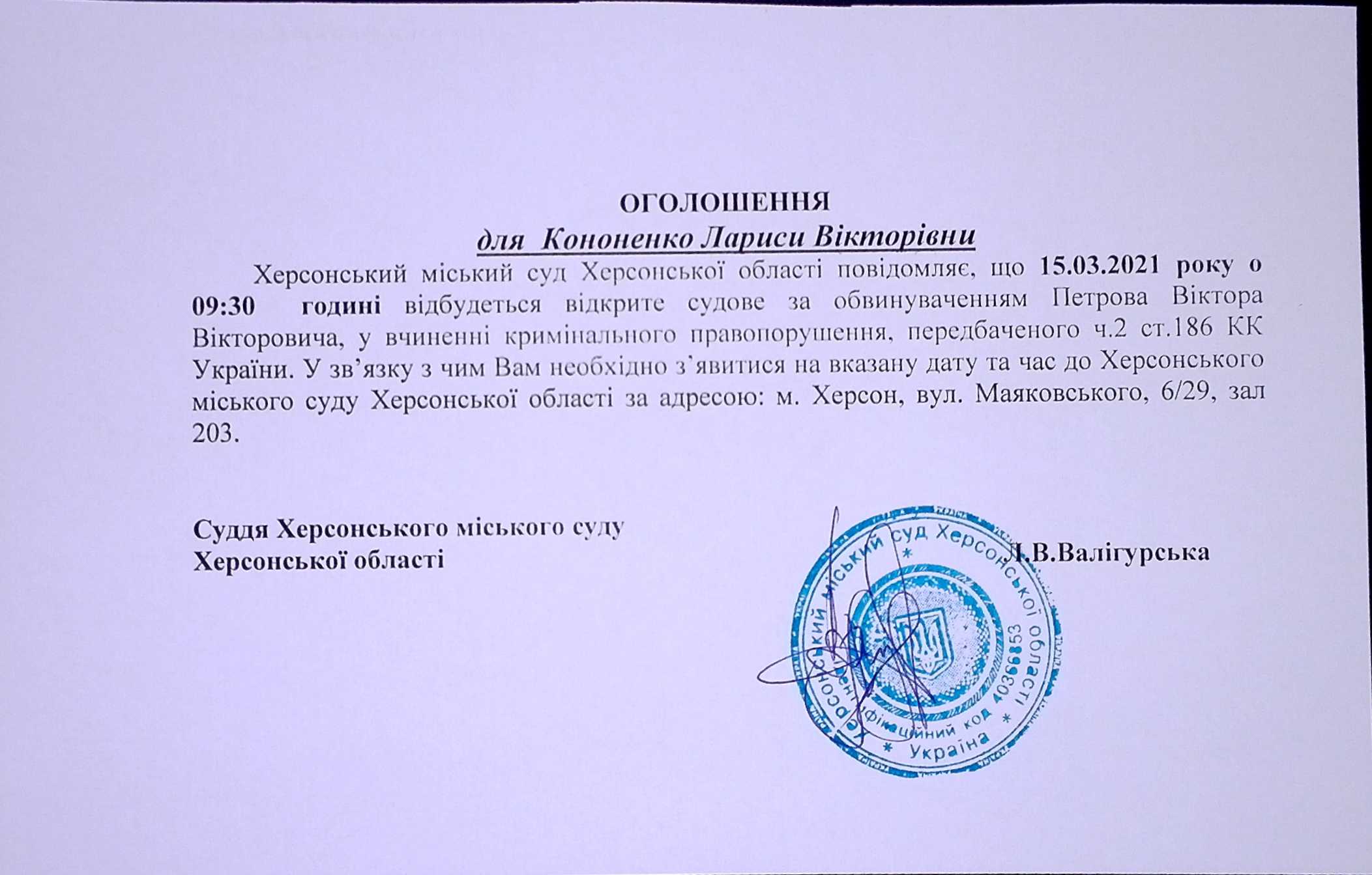 ОГОЛОШЕННЯ для Кононенко Лариси Вікторівни