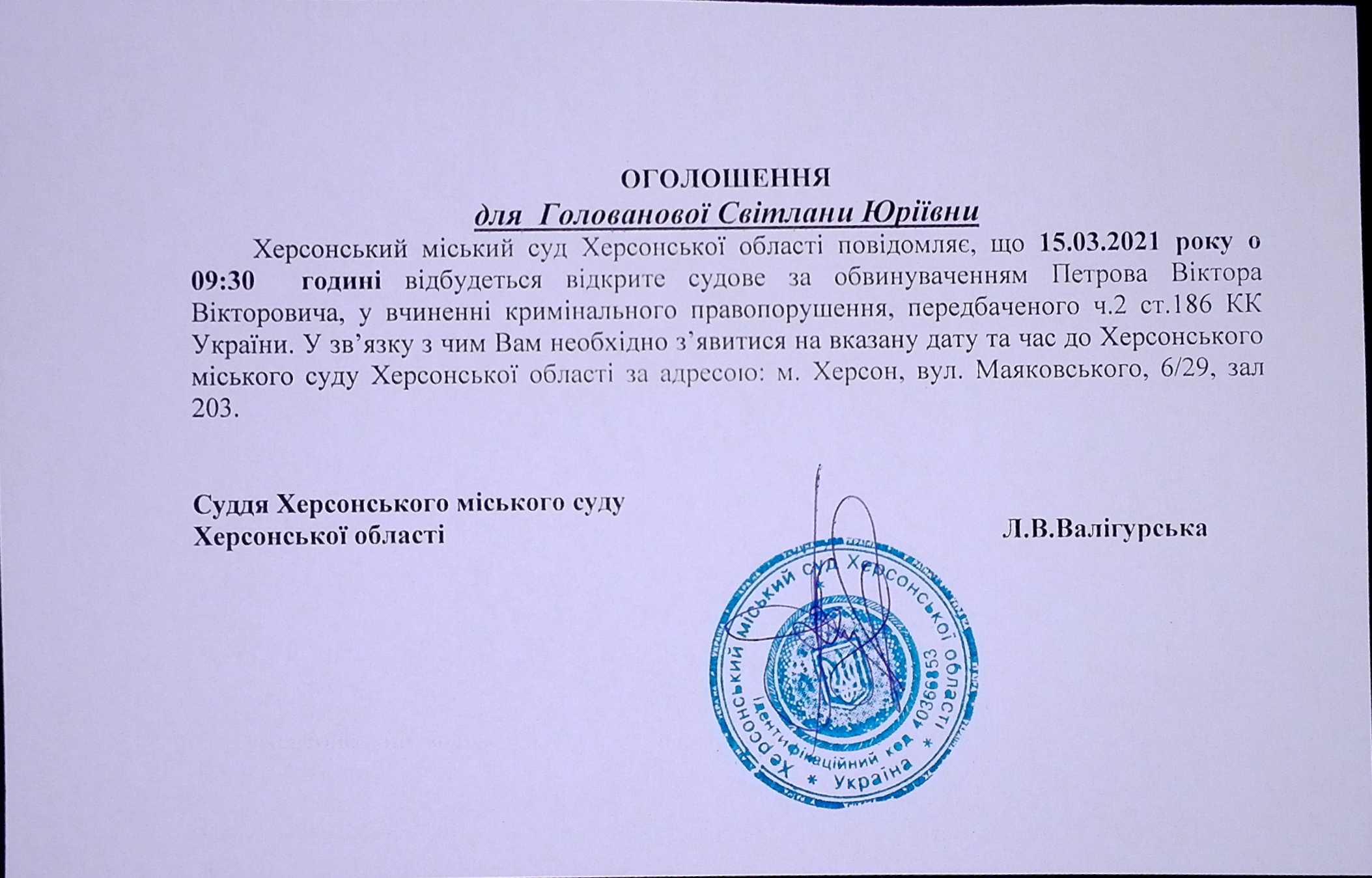 ОГОЛОШЕННЯ для Голованової Світлани Юріївни