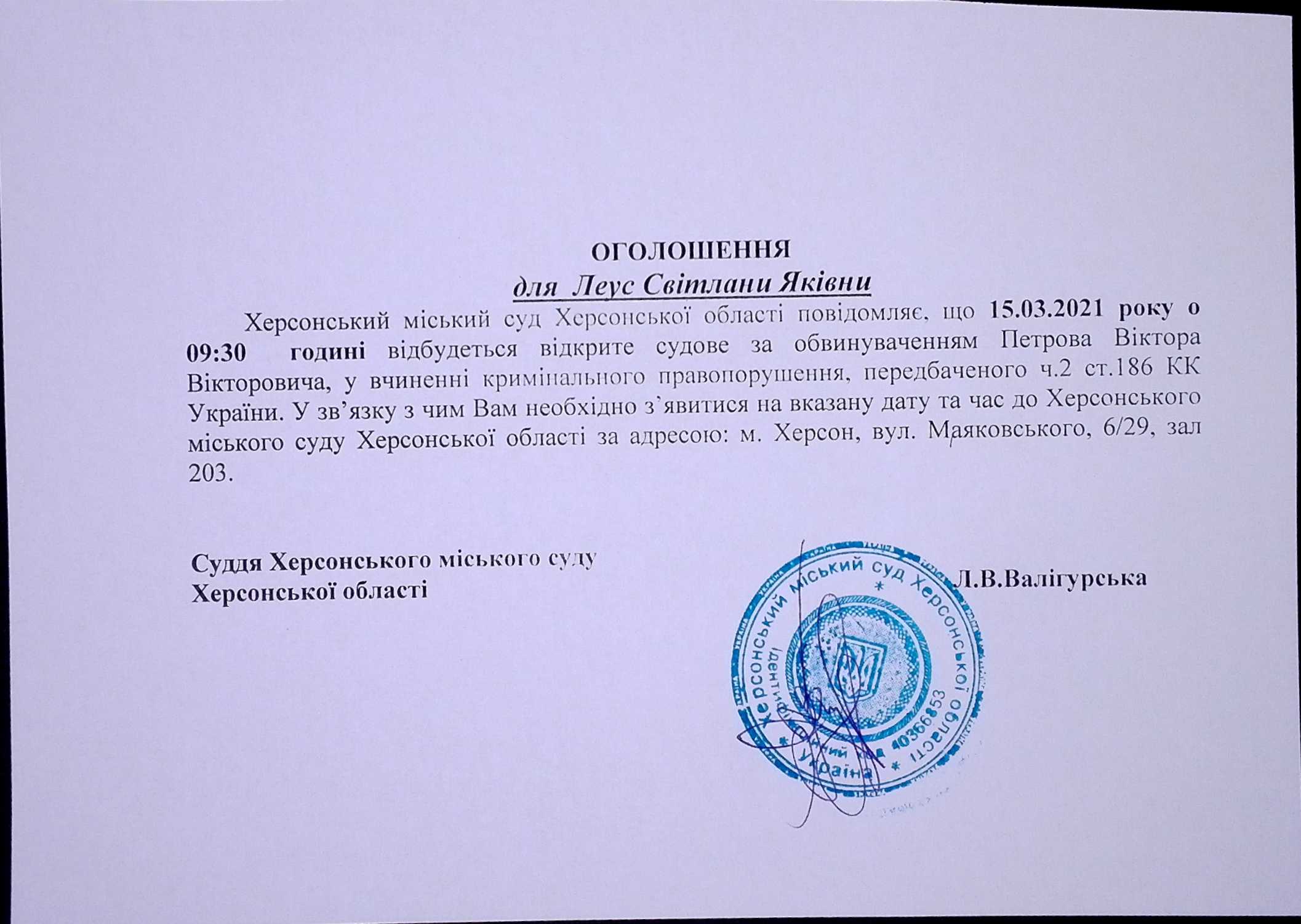 ОГОЛОШЕННЯ для Леус Світлани Яківни