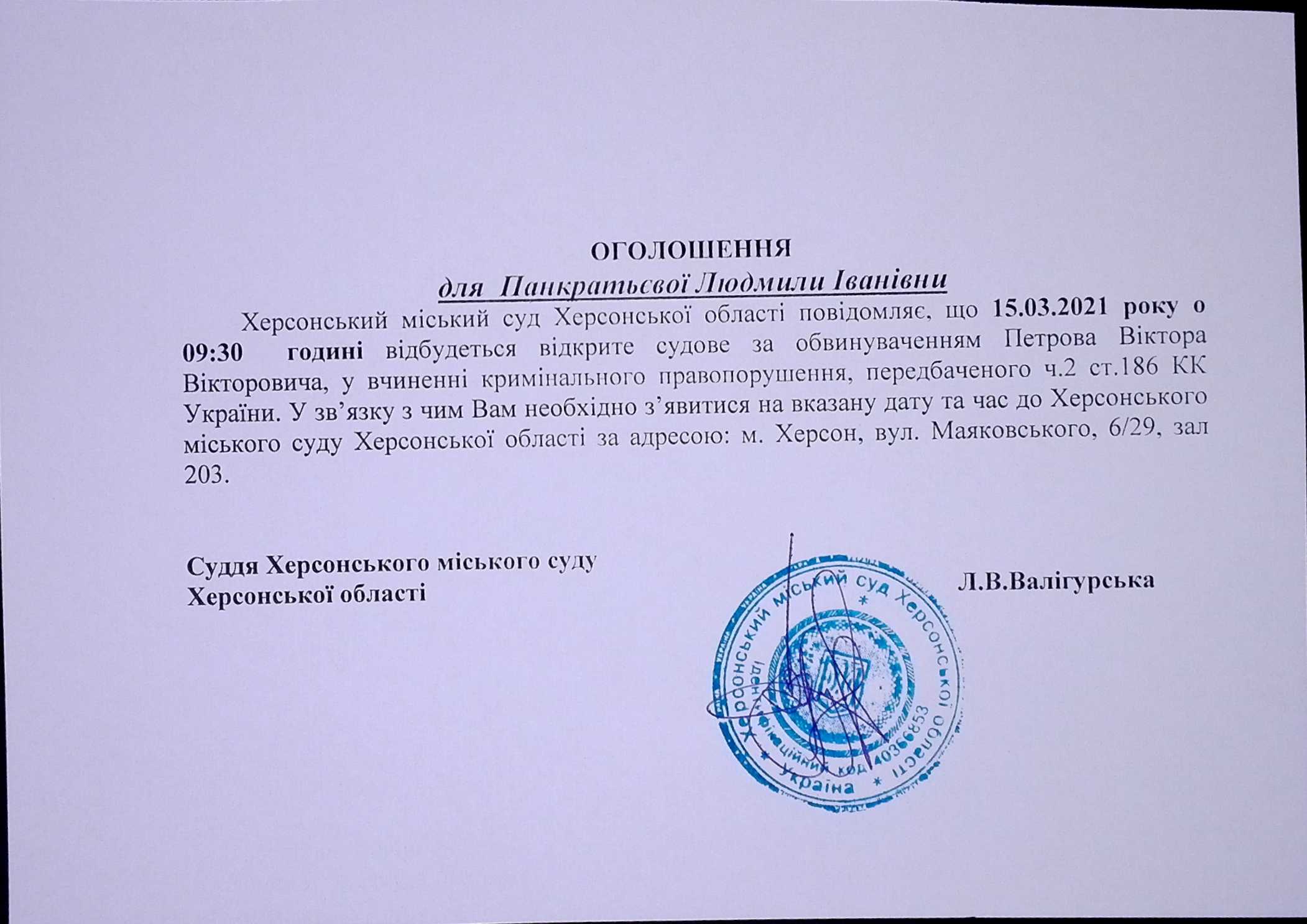 ОГОЛОШЕННЯ для Панкратьєвої Людмили Іванівни