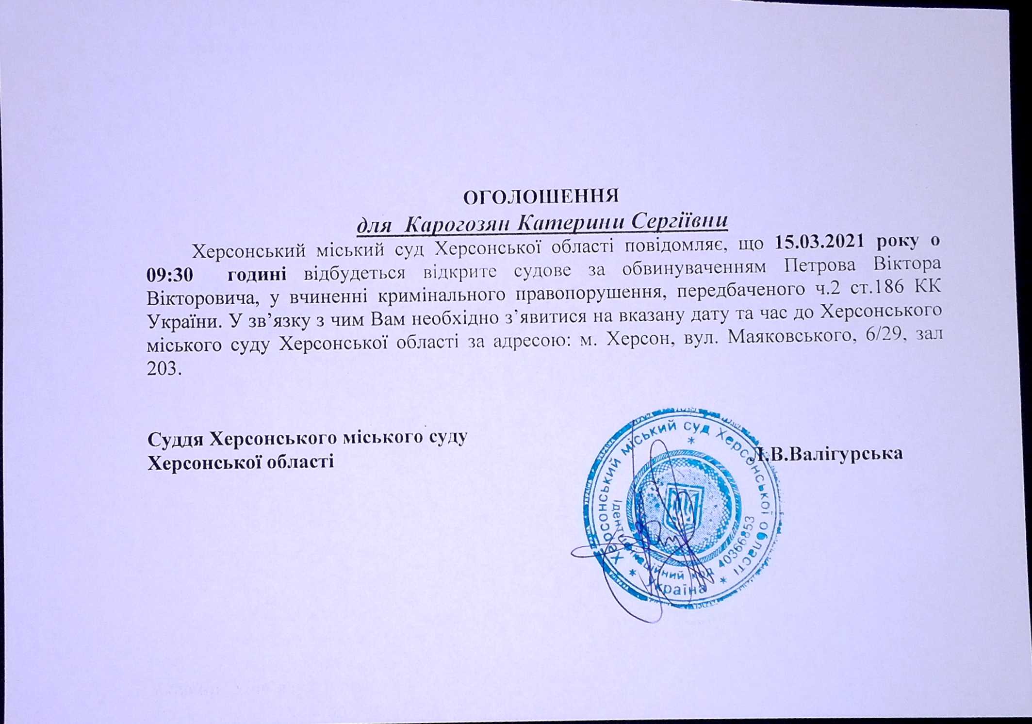 ОГОЛОШЕННЯ для Карогозян Катерини Сергіївни