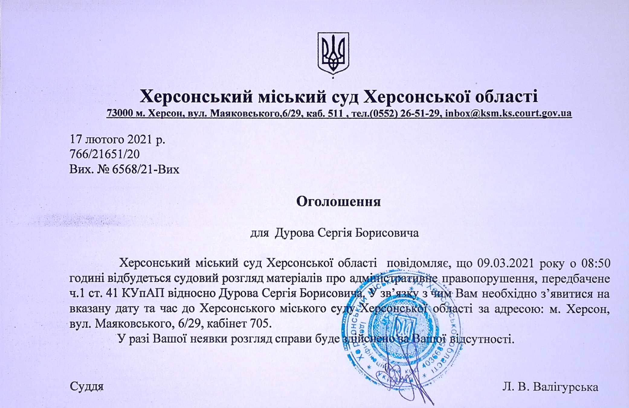 ОГОЛОШЕННЯ для Дурова Сергія Борисовича