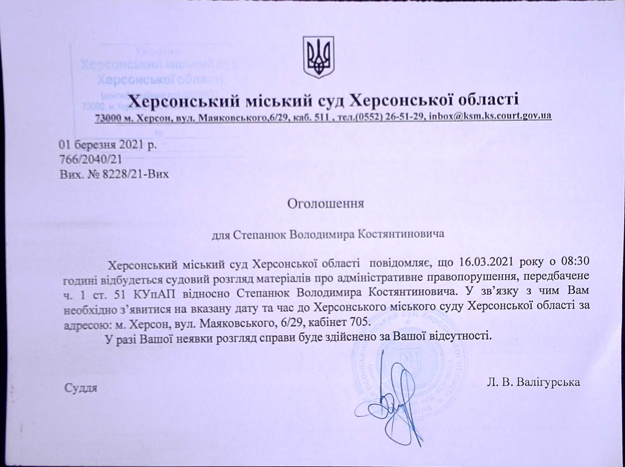 ОГОЛОШЕННЯ ПРО ВИКЛИК ДО СУДУ