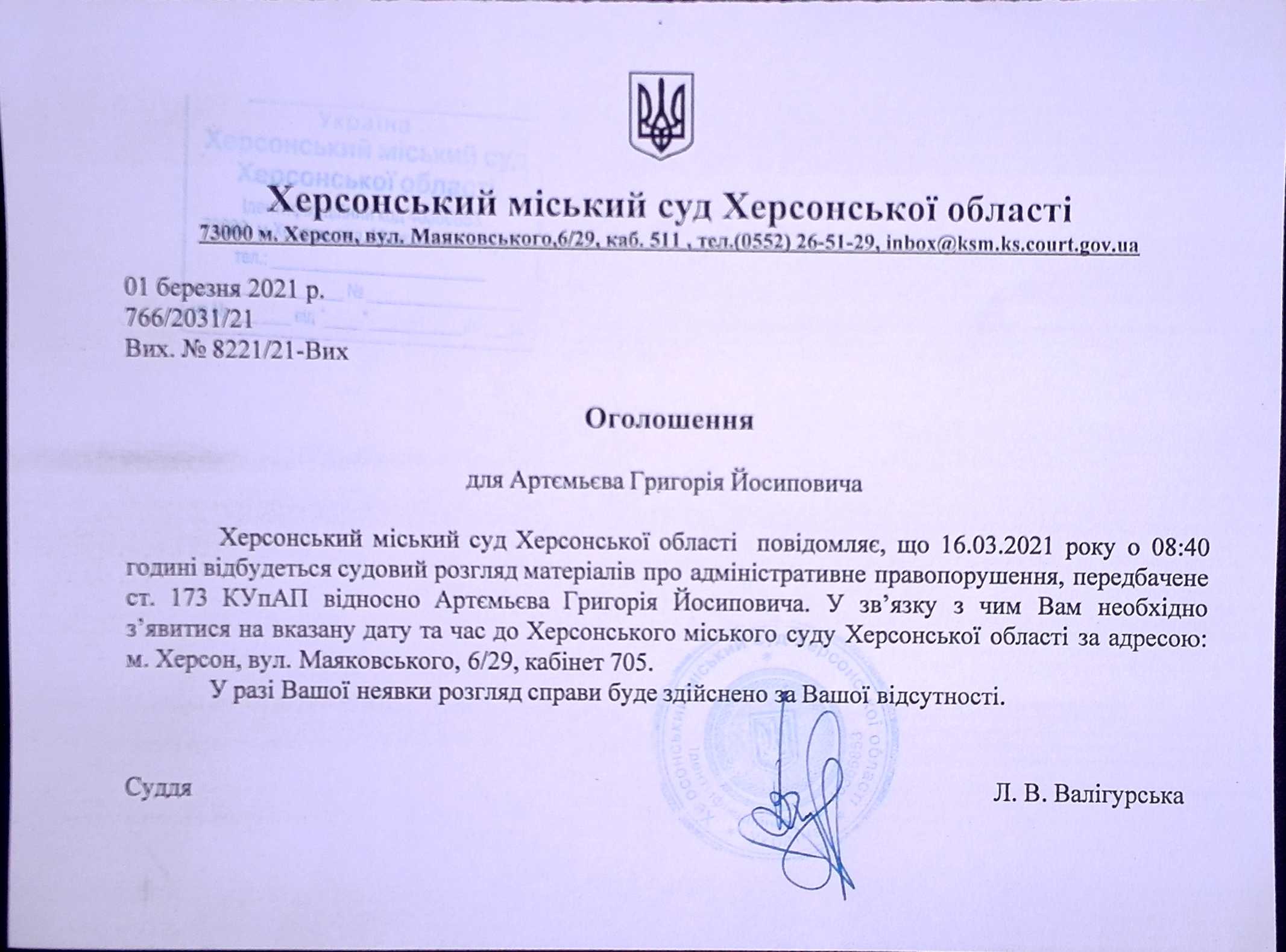 ОГОЛОШЕННЯ для Артемьєва Григорія Йосиповича