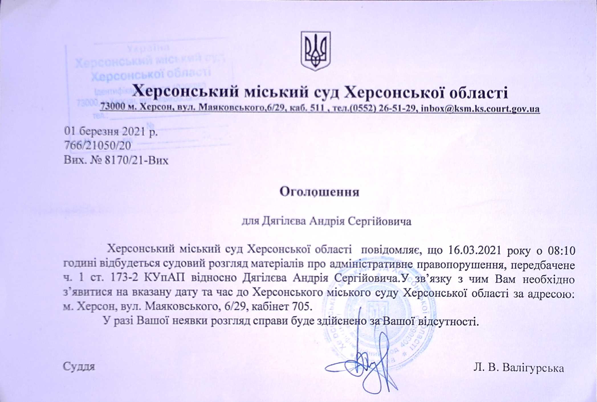 ОГОЛОШЕННЯ для Дягілєва Андрія Сергійовича