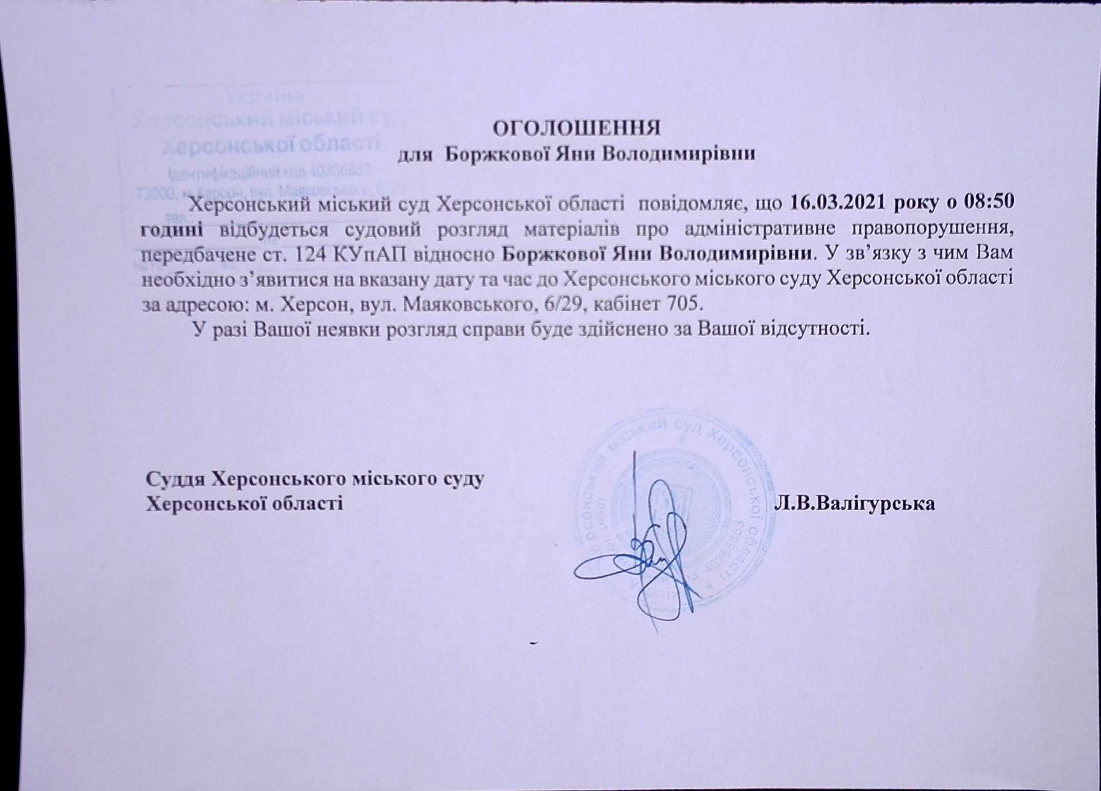 ОГОЛОШЕННЯ для Боржкової Яни Володимирівни