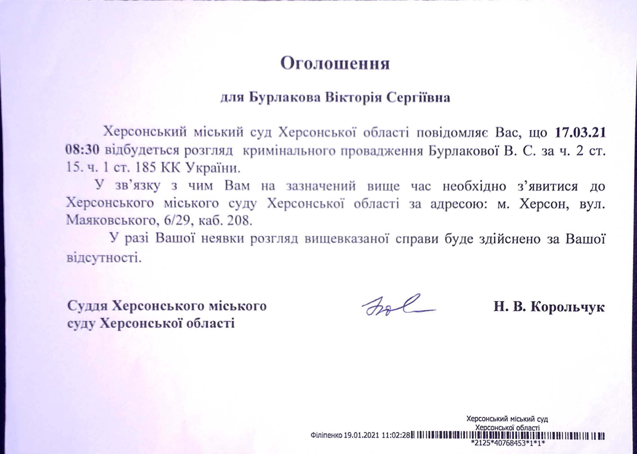ОГОЛОШЕННЯ для Бурлакова Вікторія Сергіївна
