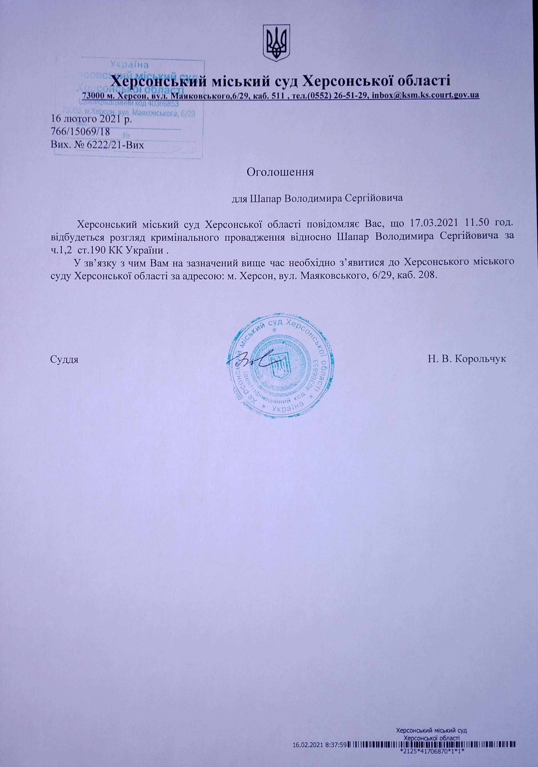 ОГОЛОШЕННЯ ПРО ВИКЛИК ДО СУДУ