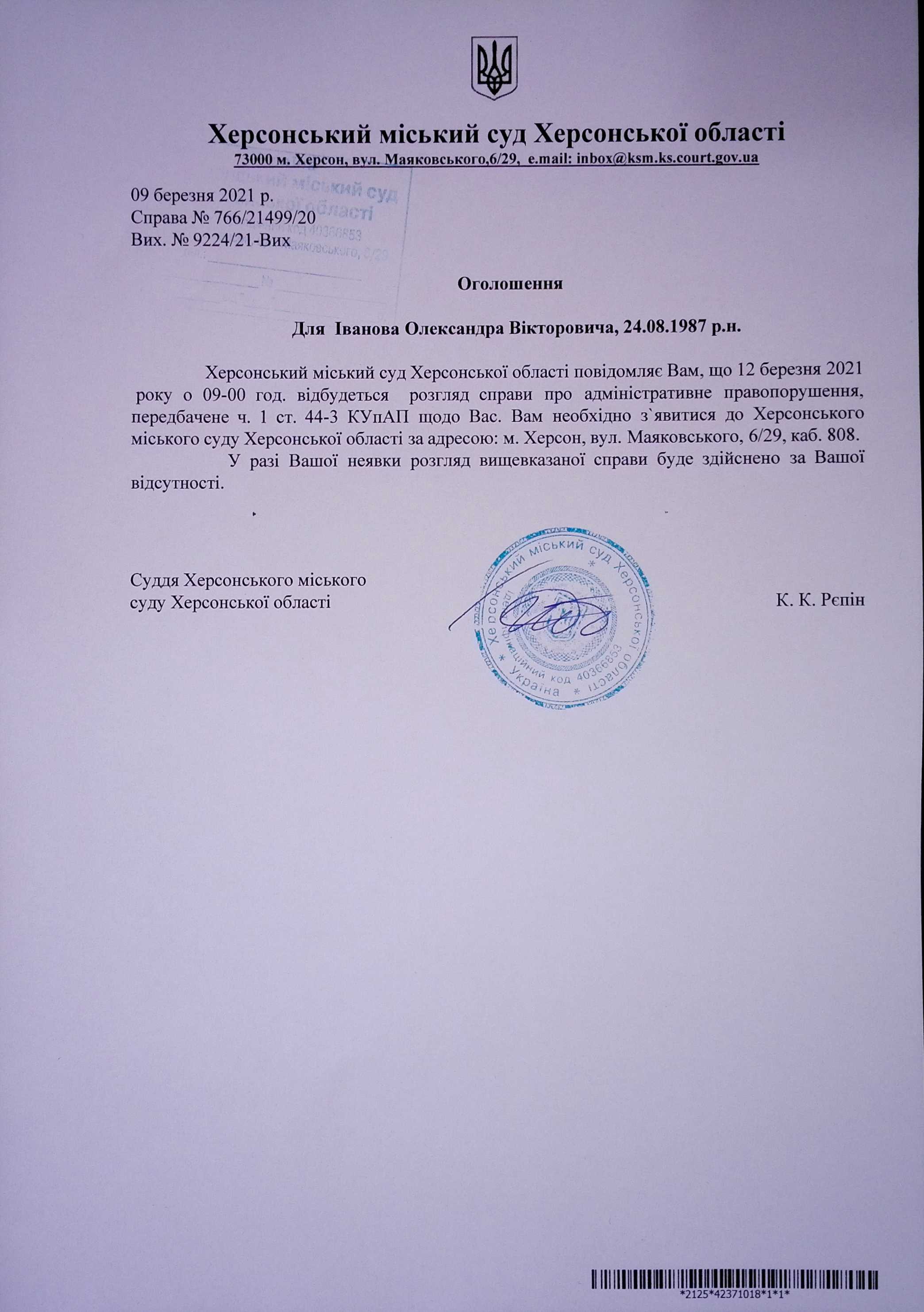 ОГОЛОШЕННЯ для Іванова Олександра Вікторовича