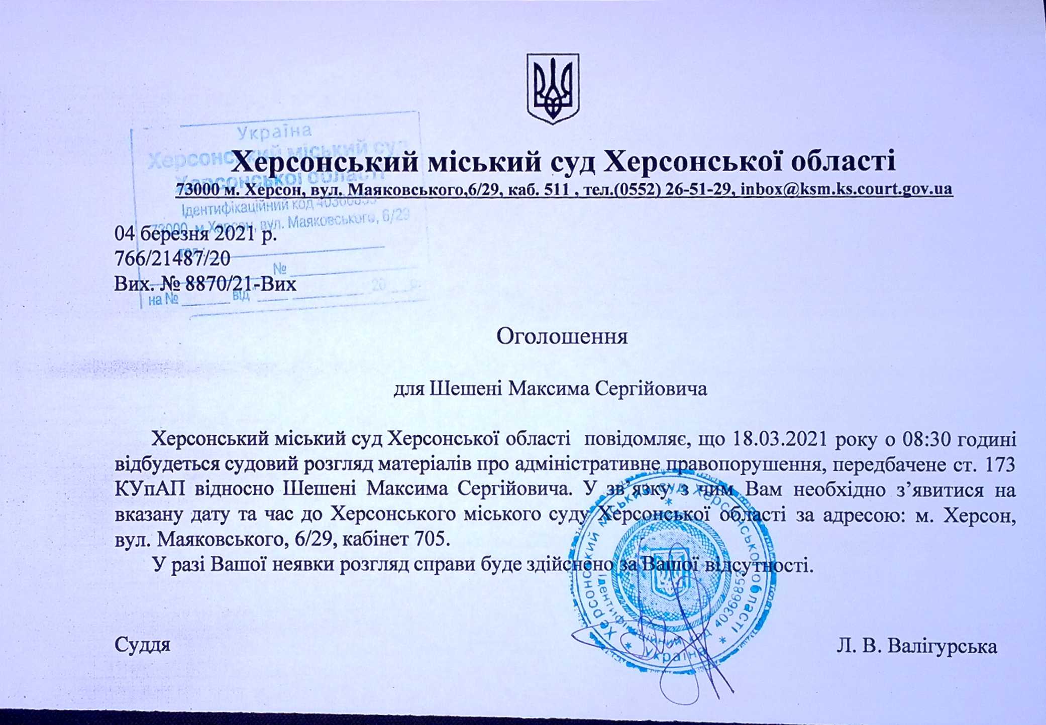 ОГОЛОШЕННЯ ПРО ВИКЛИК ДО СУДУ